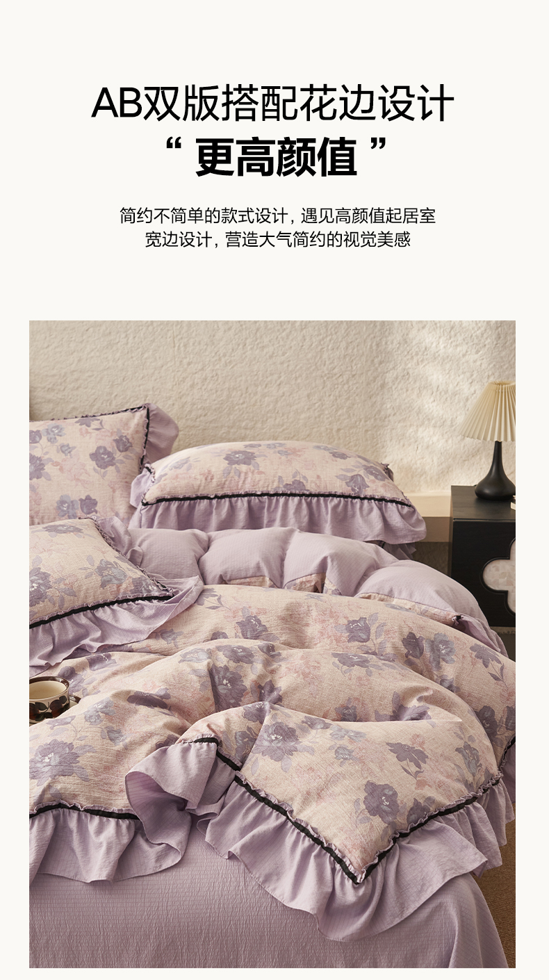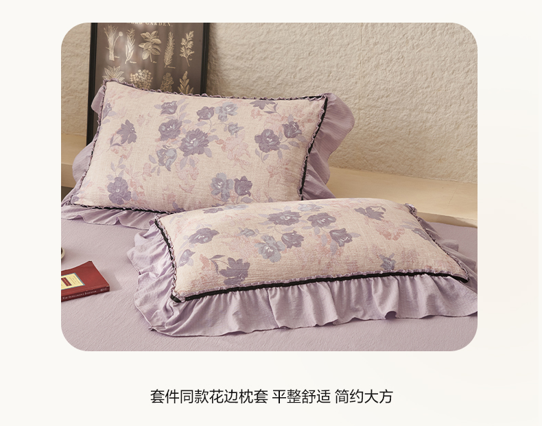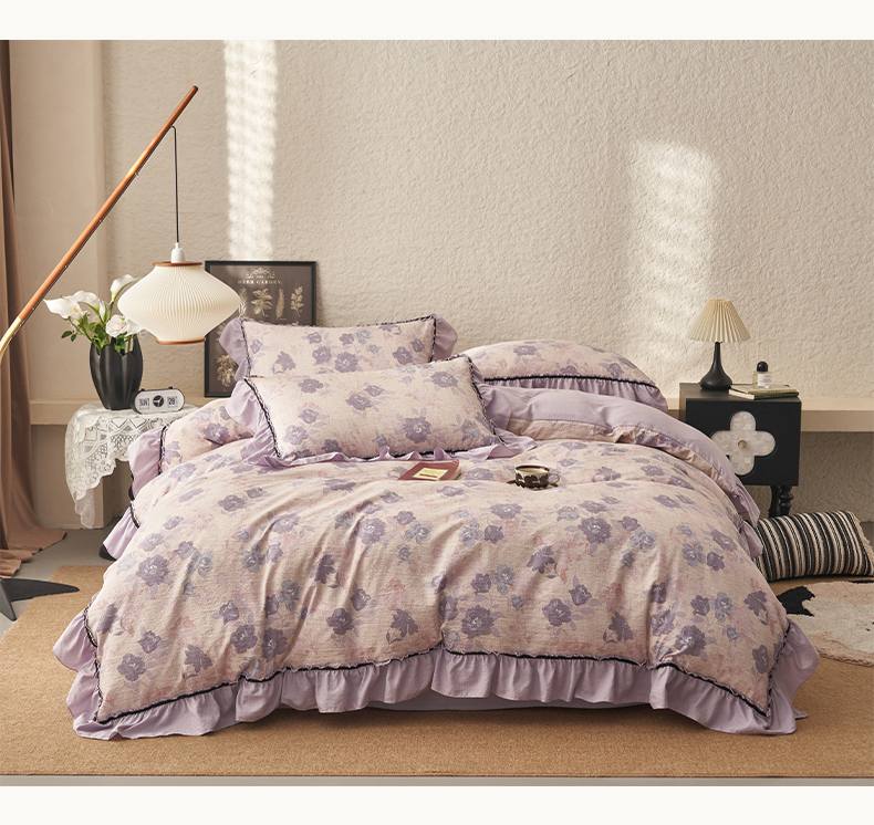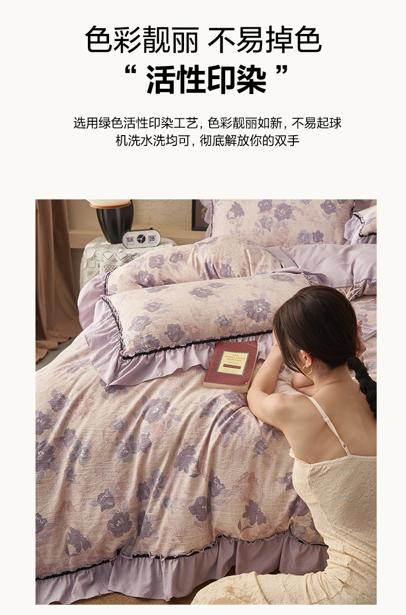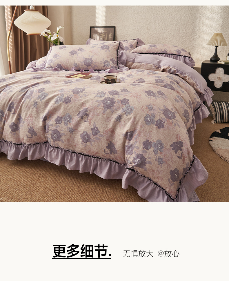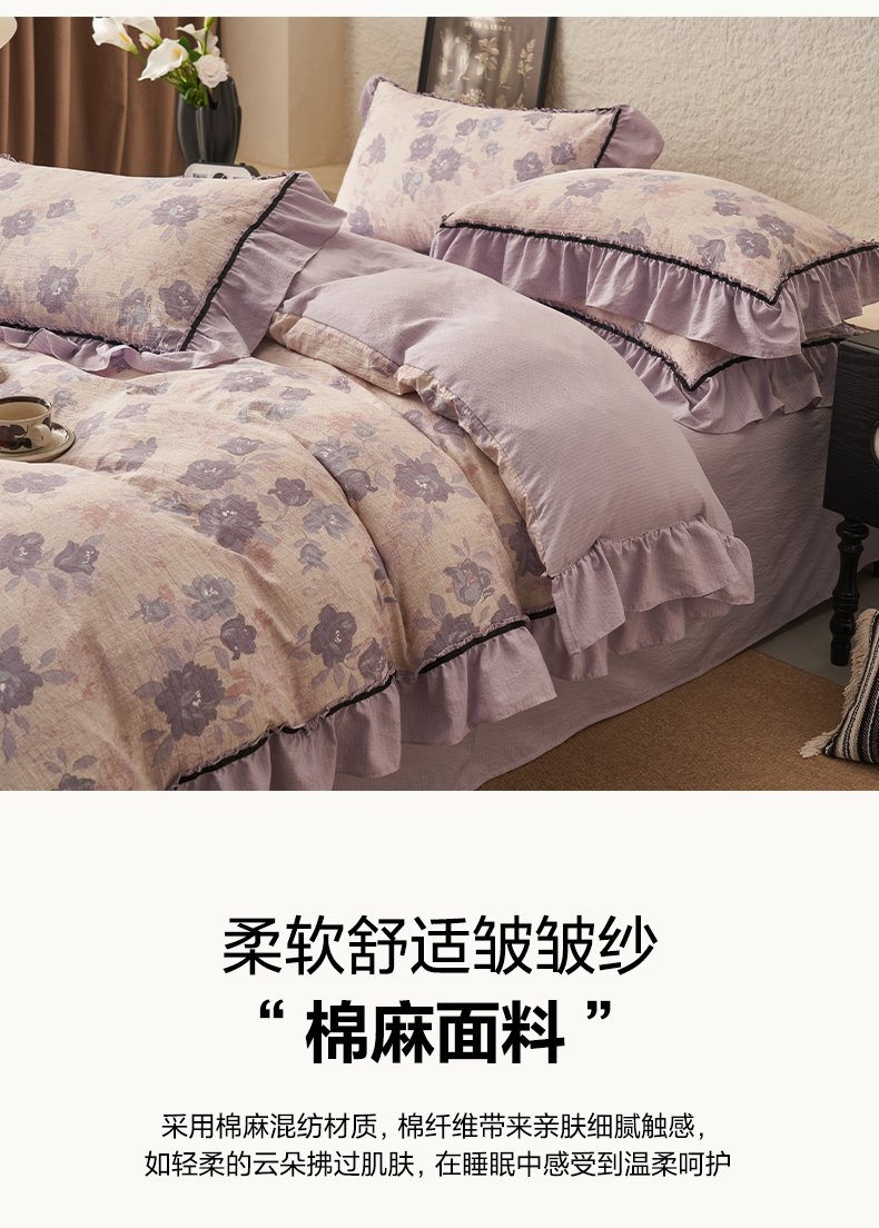 当前位置: 91家纺网 > 商品网购 > 床品套件 > 四件套 > 其它四件套 > 晨曦家纺 2026春夏新款复古博主风A类亚麻皱皱纱花边四件套 秋野紫玫