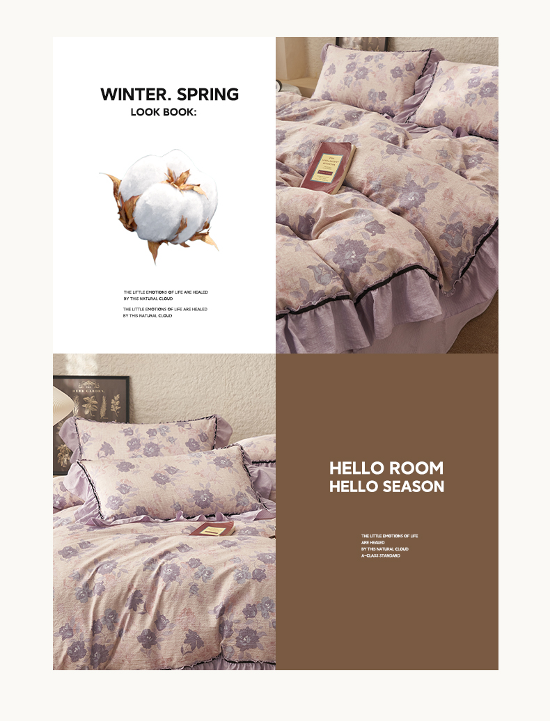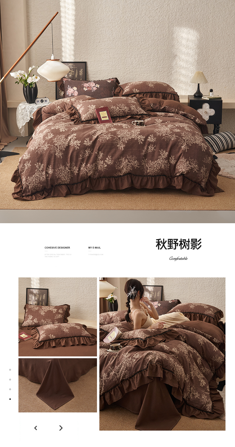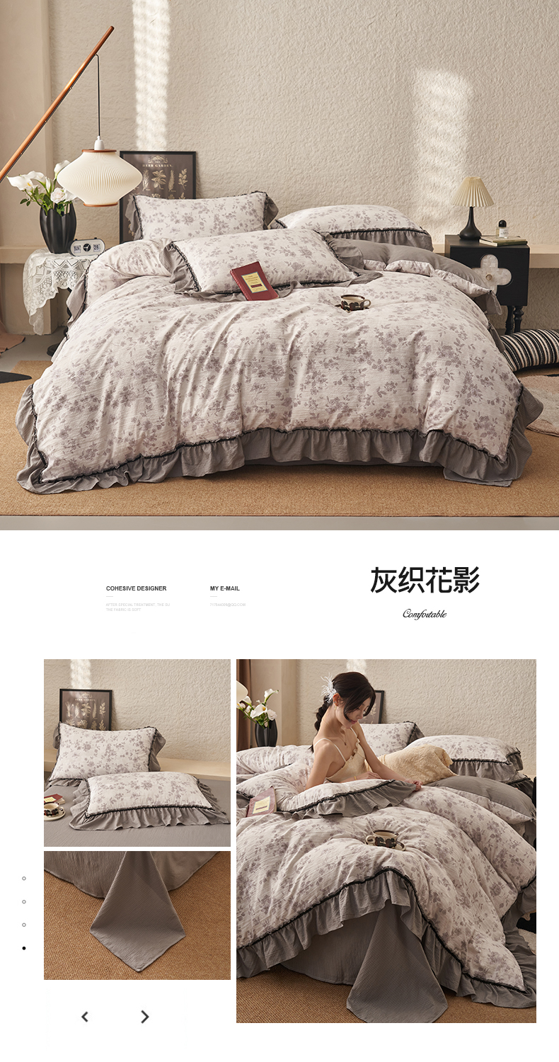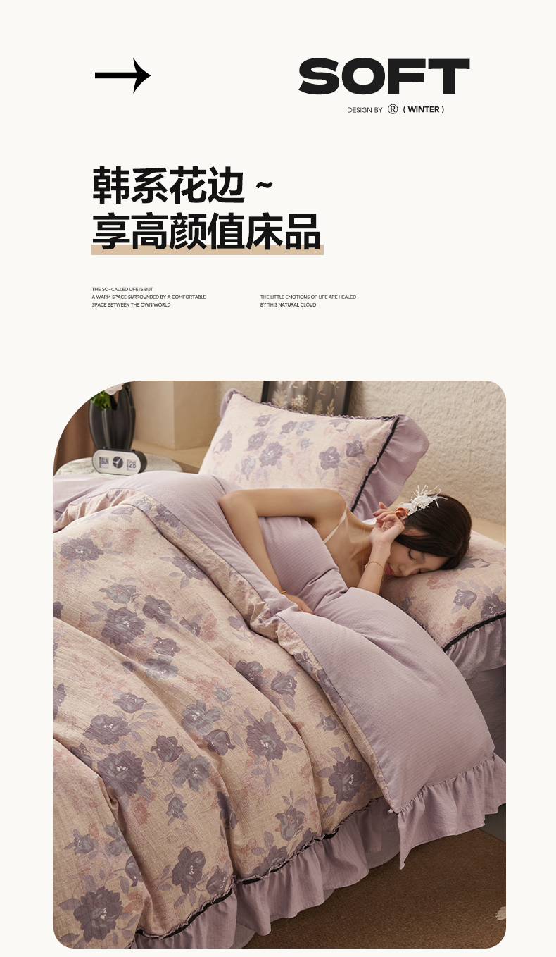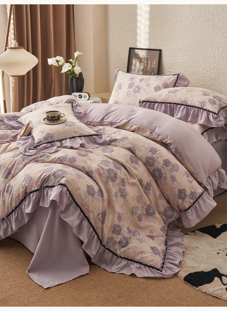 当前位置: 91家纺网 > 商品网购 > 床品套件 > 四件套 > 其它四件套 > 晨曦家纺 2026春夏新款复古博主风A类亚麻皱皱纱花边四件套 秋野紫玫