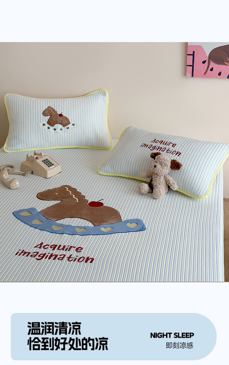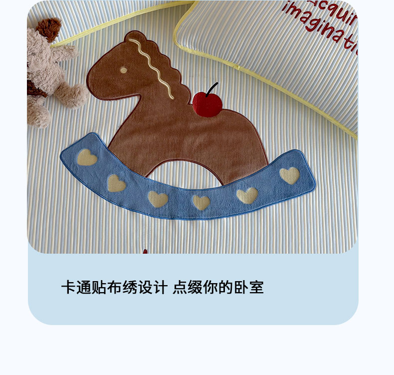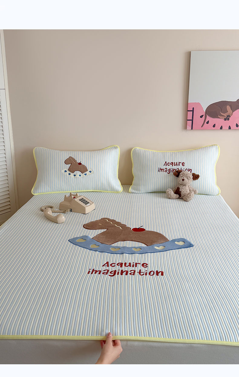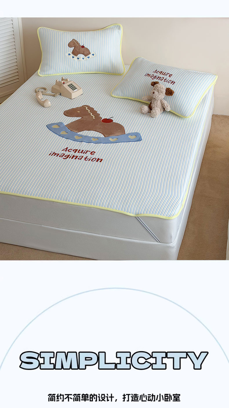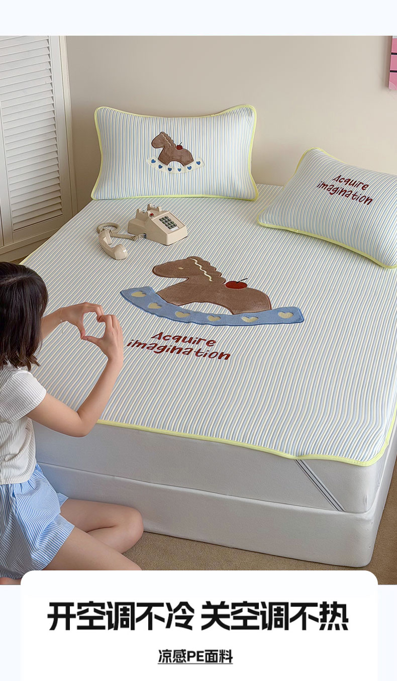 • 91家纺网 家纺一手货源 找家纺 桃子家居 2026新款A类PE凉感卡通贴布绣高端工艺空调软席床席床笠凉席三件套 PE贴布绣-爱心木马
