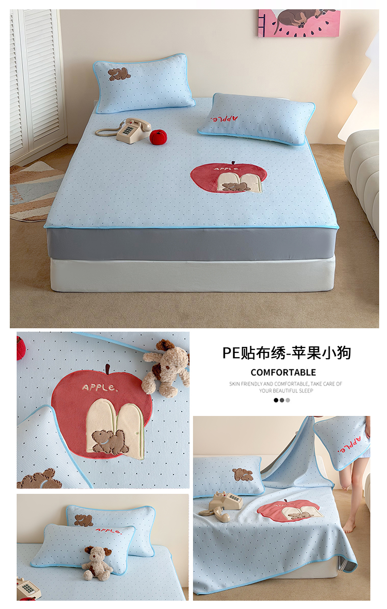 • 91家纺网 家纺一手货源 找家纺 (总)桃子家居 2026新款A类PE凉感卡通贴布绣高端工艺空调软席床席床笠凉席三件套,组合图,PE贴布绣-爱心木马,PE贴布绣-番茄仙女兔,PE贴布绣-酷酷猫,PE贴布绣-苹果小狗,PE贴布绣-清新熊