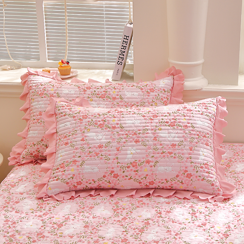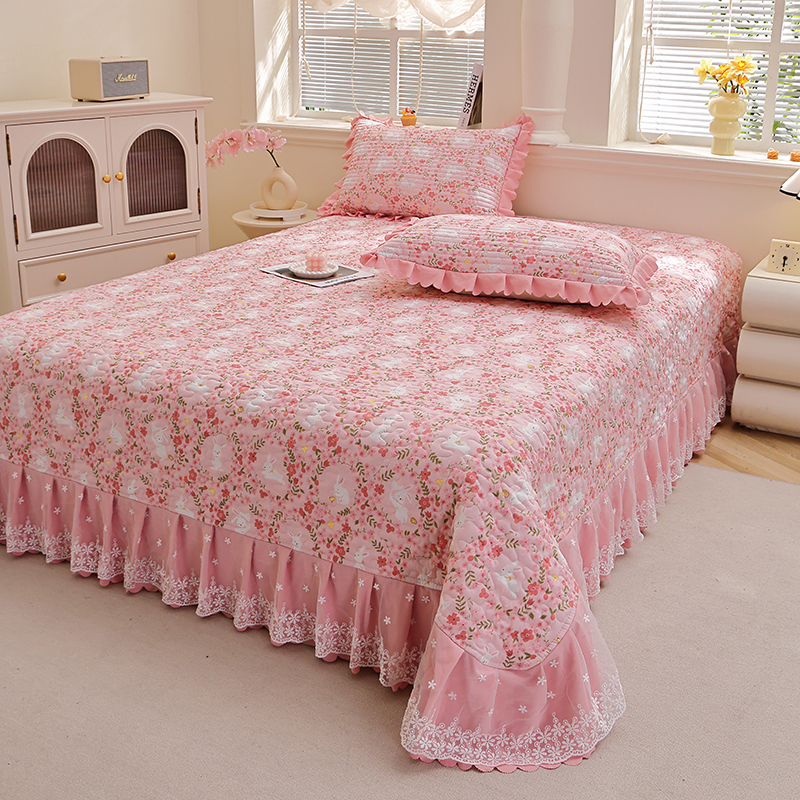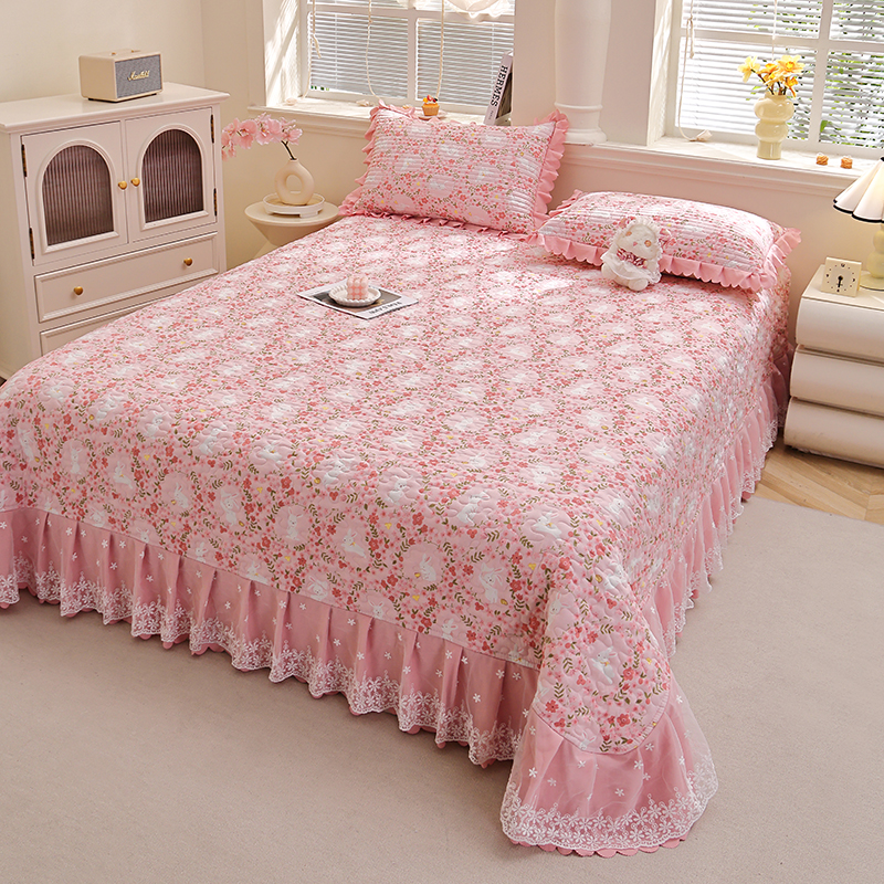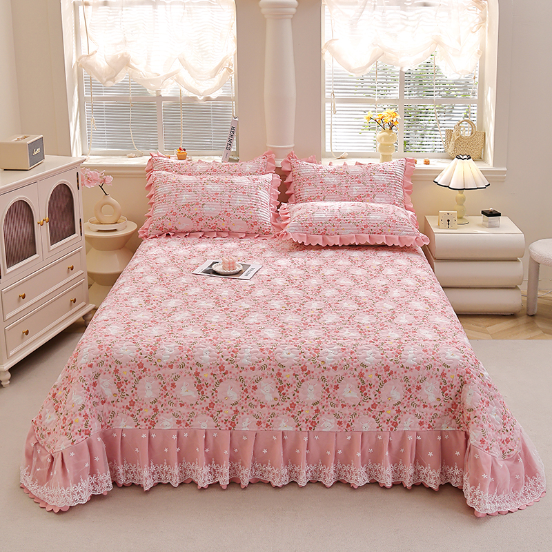 彩亿家纺 2026春夏新品四季床盖泡芙棉双层纱蕾丝床裙加厚床单 小桃兔