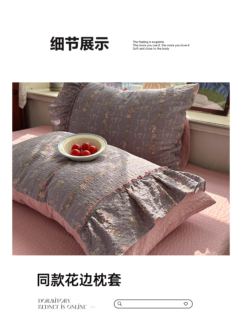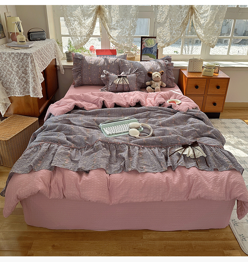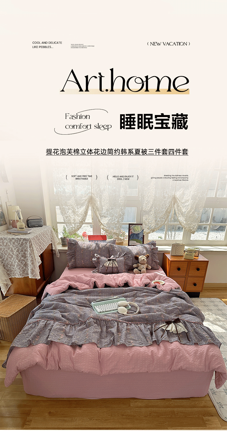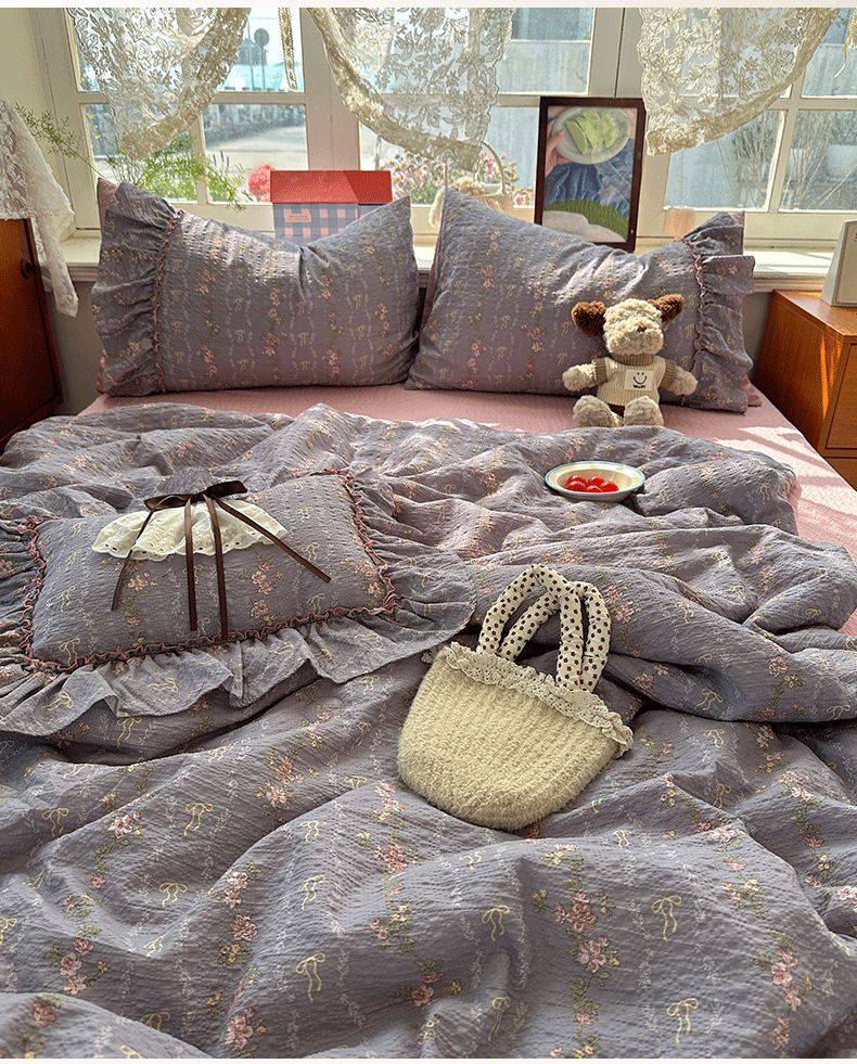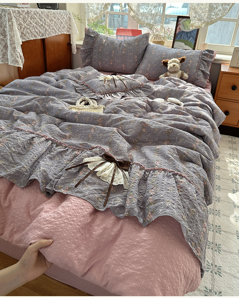 当前位置: 91家纺网 > 商品网购 > 床品套件 > 四件套 > 化纤普通四件套 > 栩裕纺织 2026新款提花泡芙棉立体花边简约韩系夏被-夏被三件套四件套 烟粉紫韵