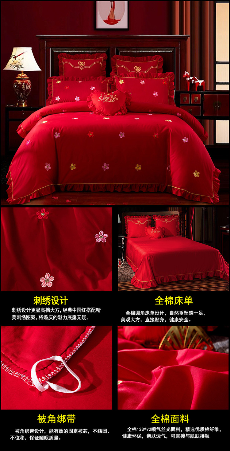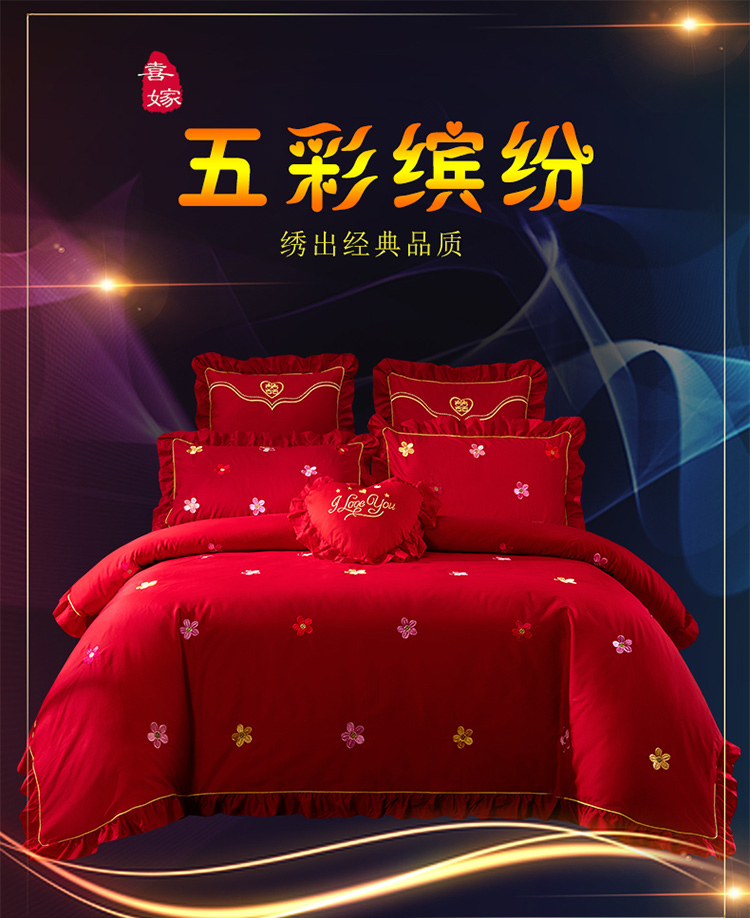商品名称:慕她 婚庆四件套大红色刺绣全棉纯棉结婚多件套五彩缤纷