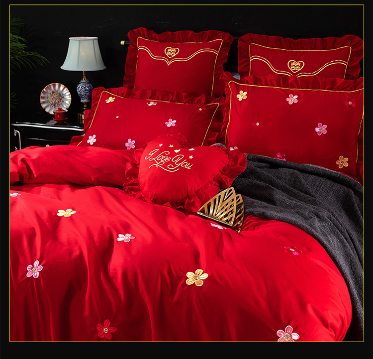 慕她 婚庆四件套大红色刺绣全棉纯棉结婚多件套五彩缤纷