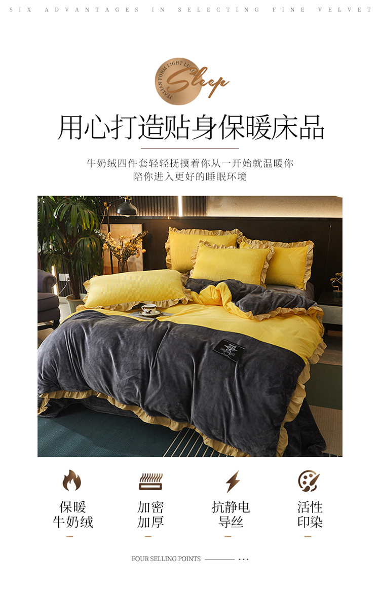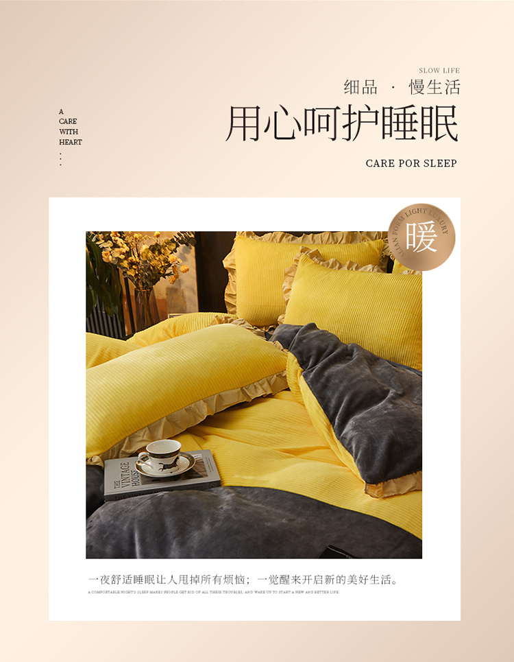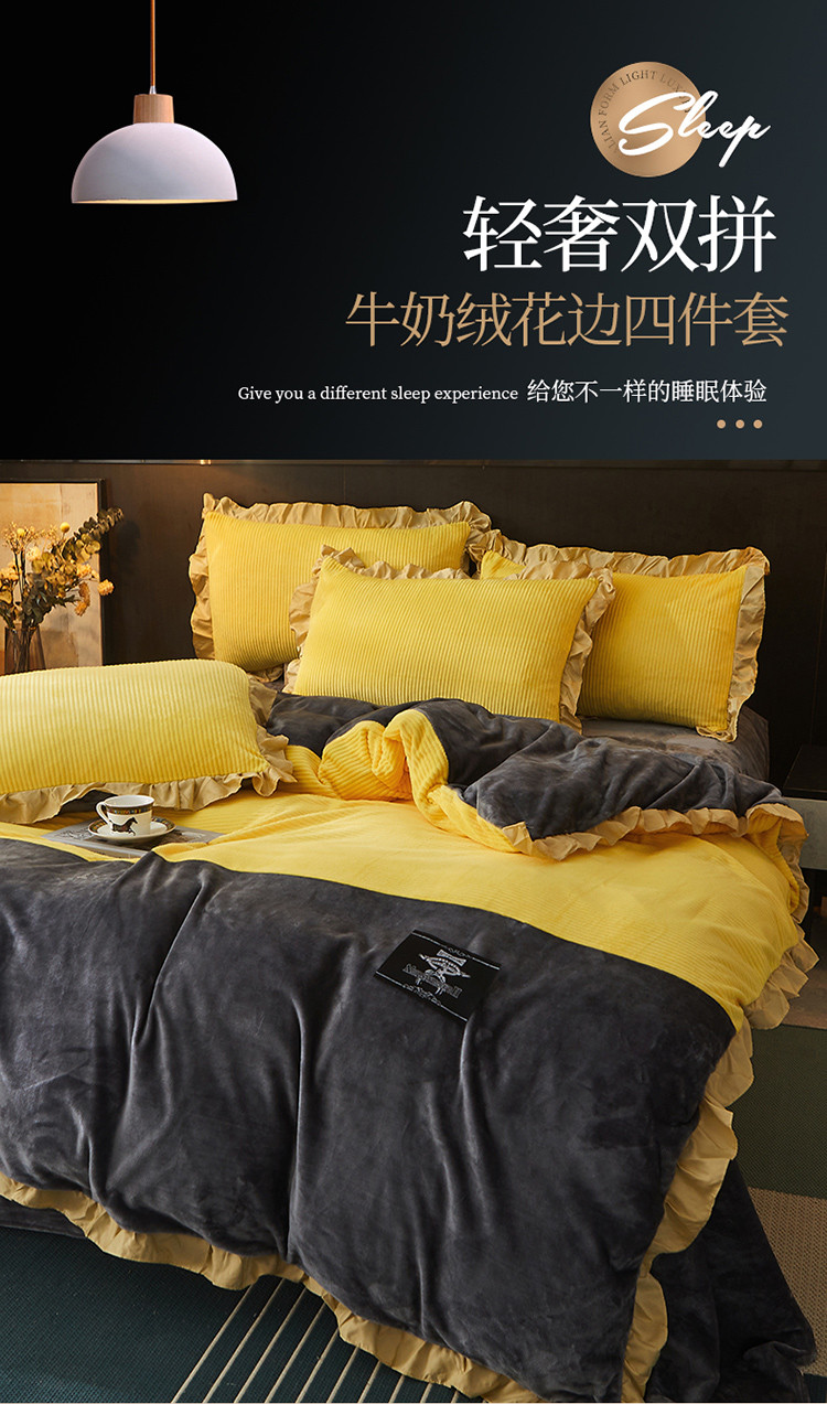 芃成家纺 2021新款牛奶绒双拼花边四件套 条纹双拼花边姜黄