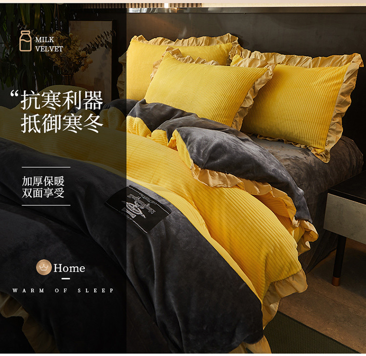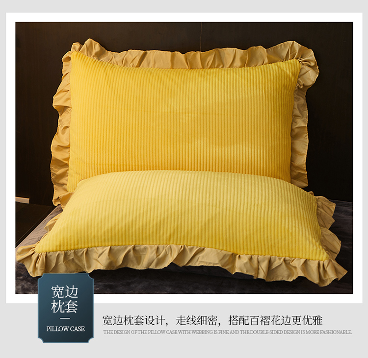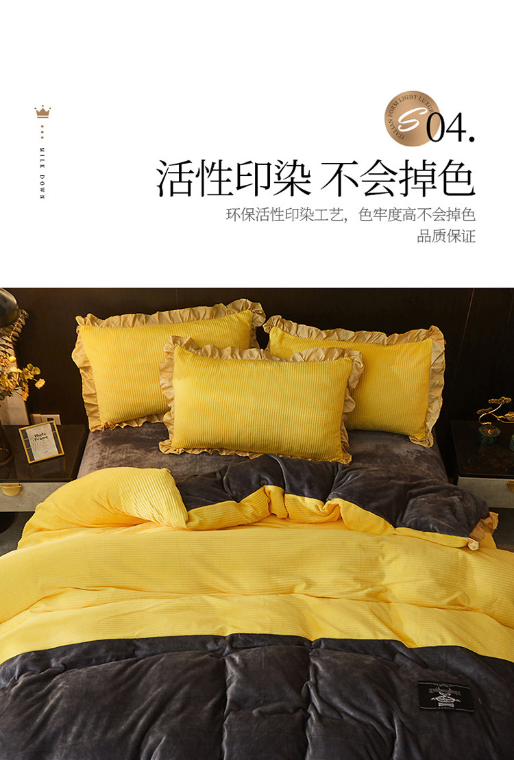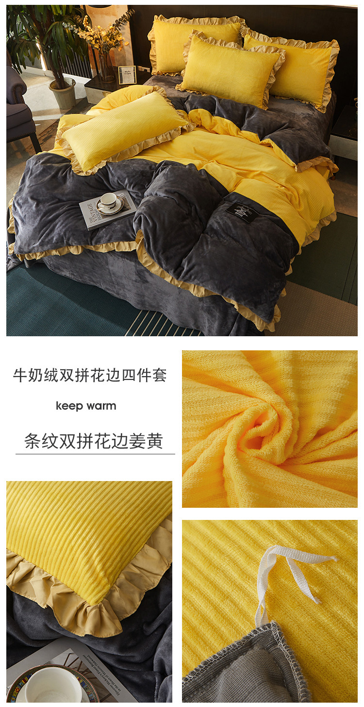 商品名称:芃成家纺 2021新款牛奶绒双拼花边四件套 条纹双拼花边姜黄