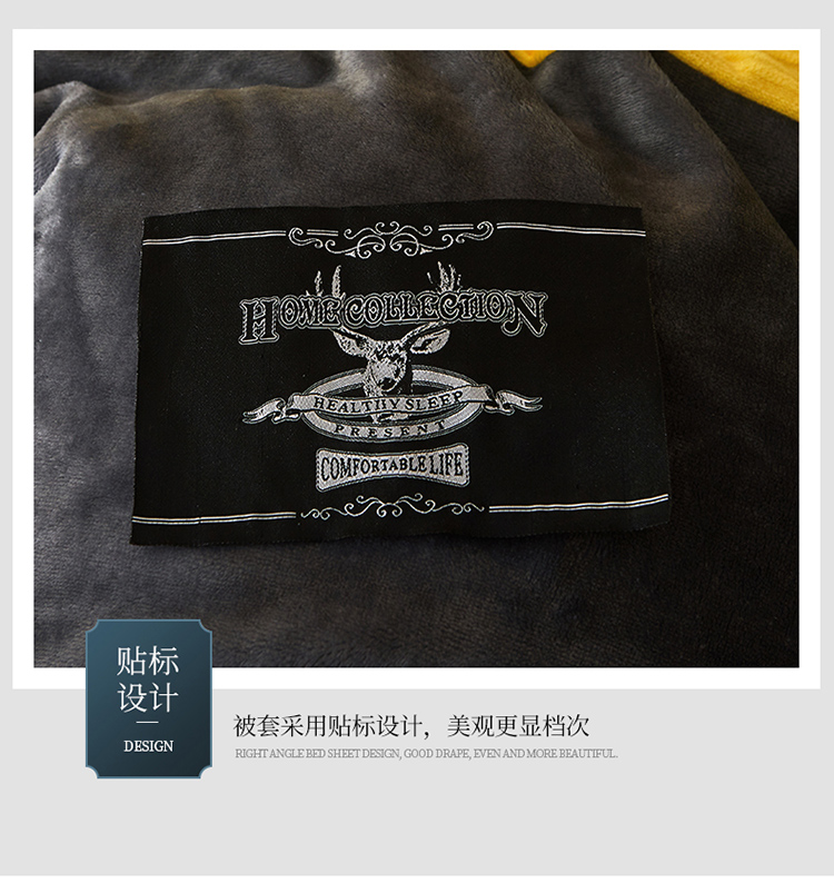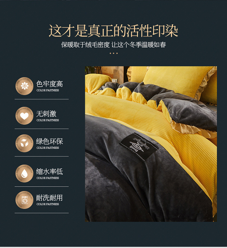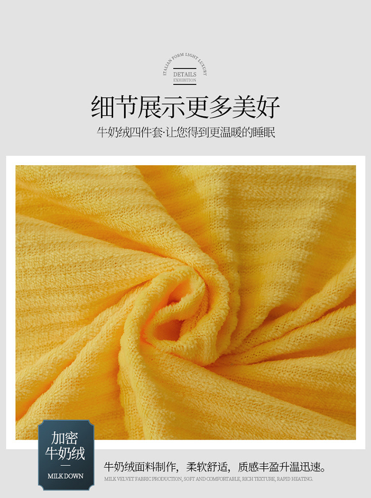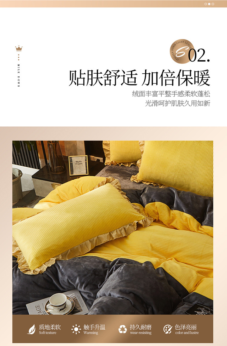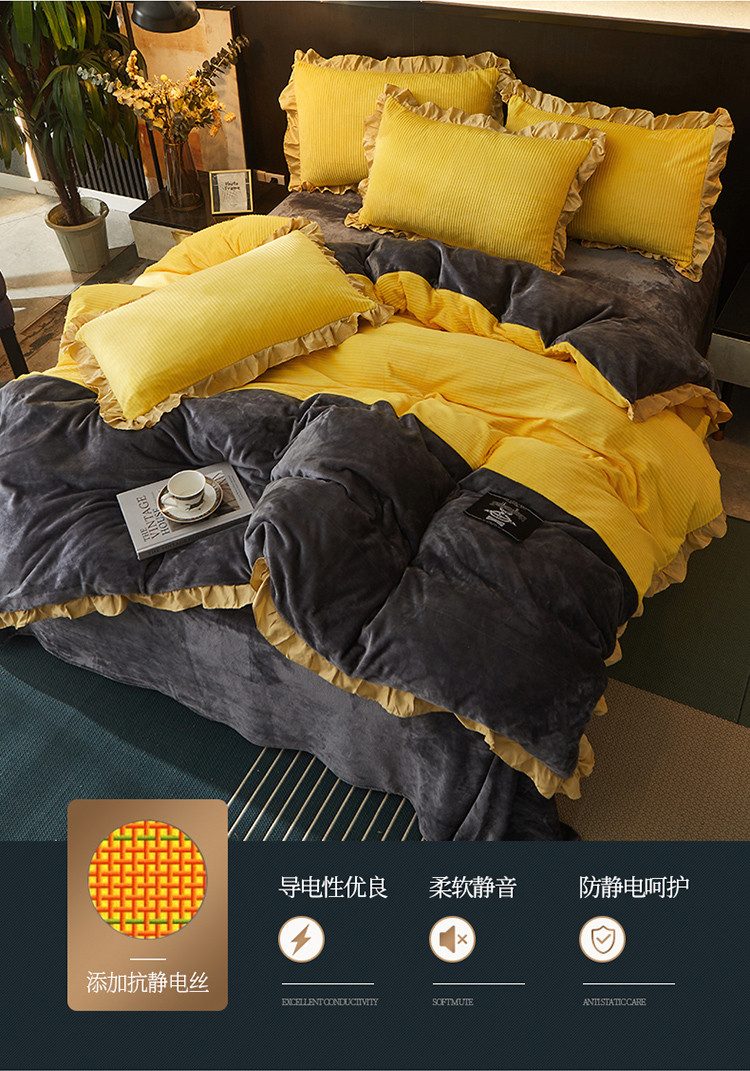 商品名称:芃成家纺 2021新款牛奶绒双拼花边四件套 条纹双拼花边姜黄
