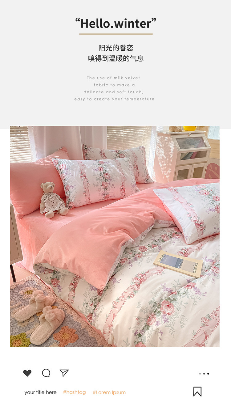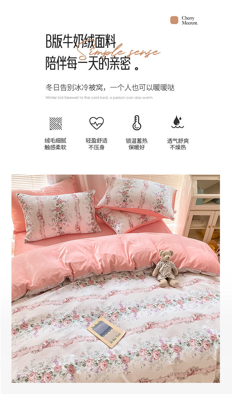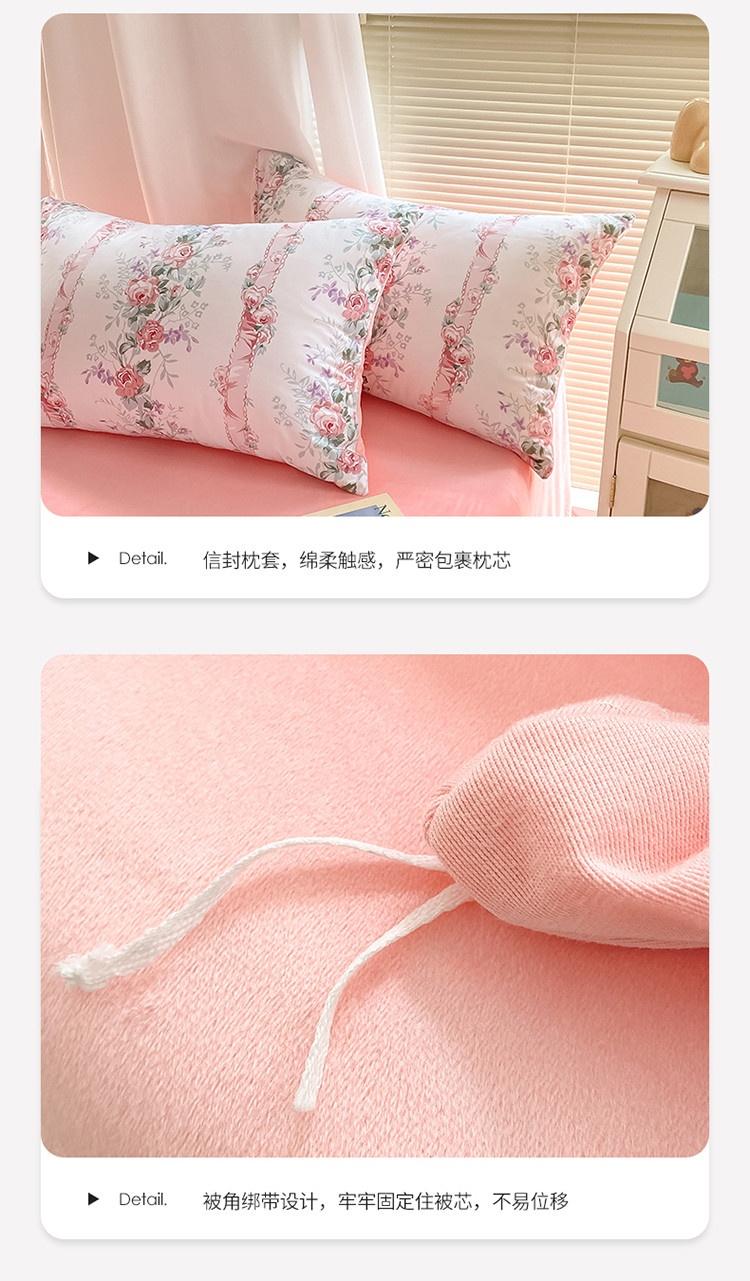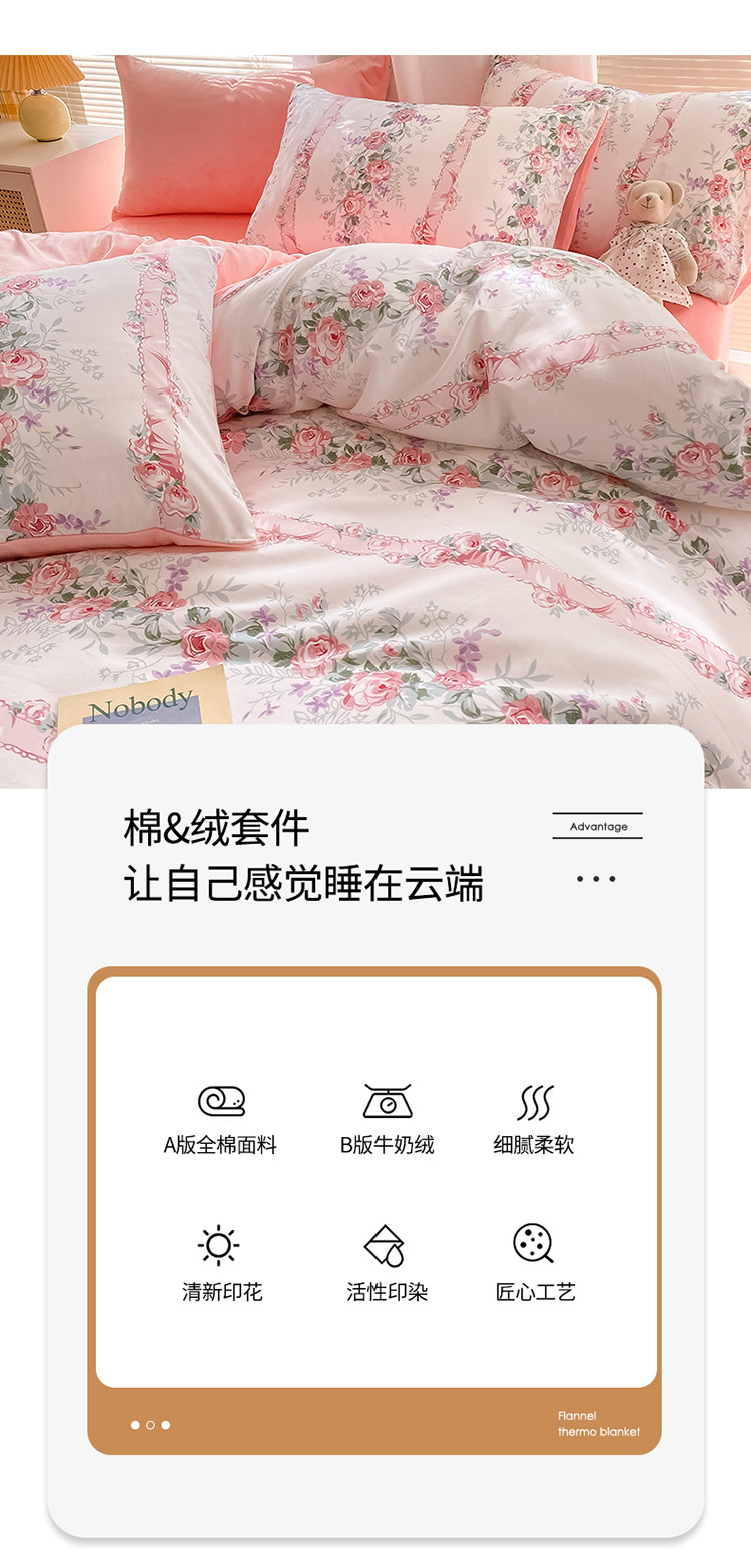 商品名称:2022新款全棉+水晶绒四件套 粉色花语