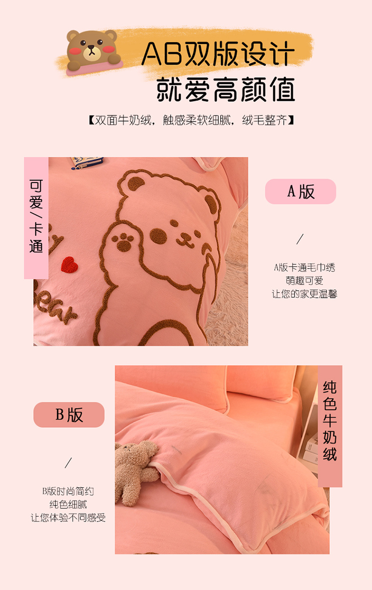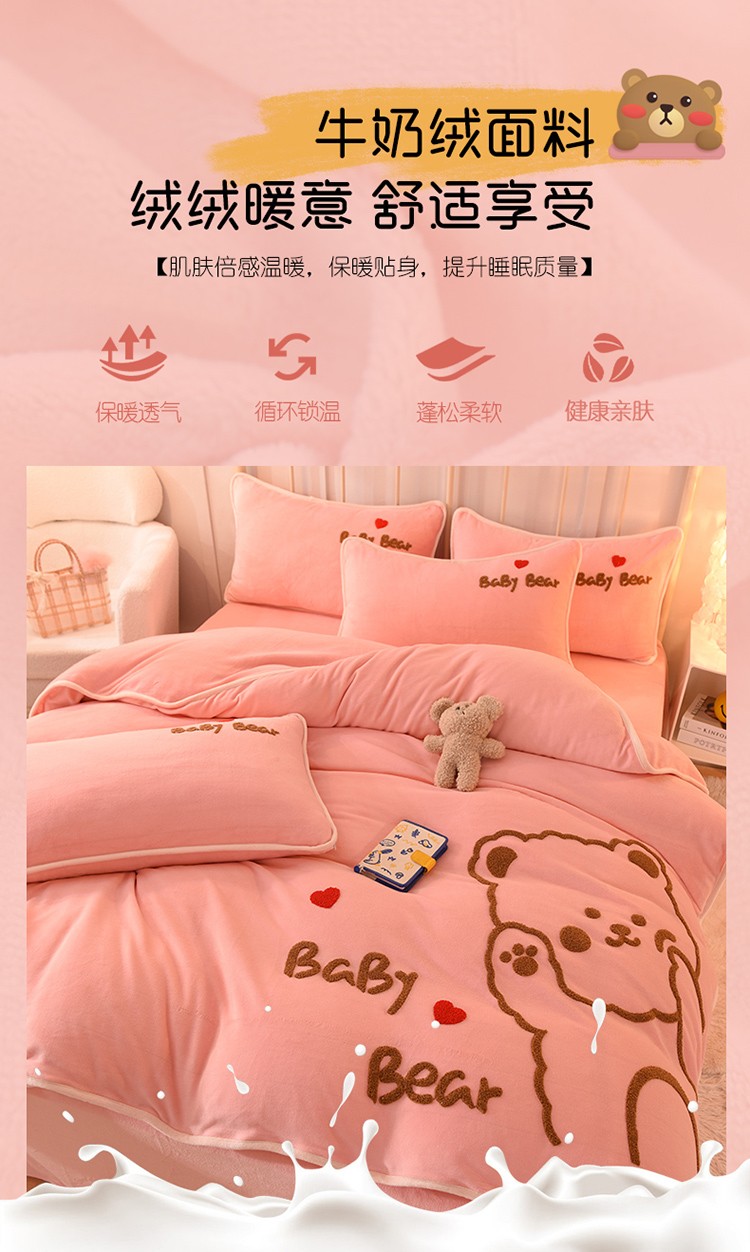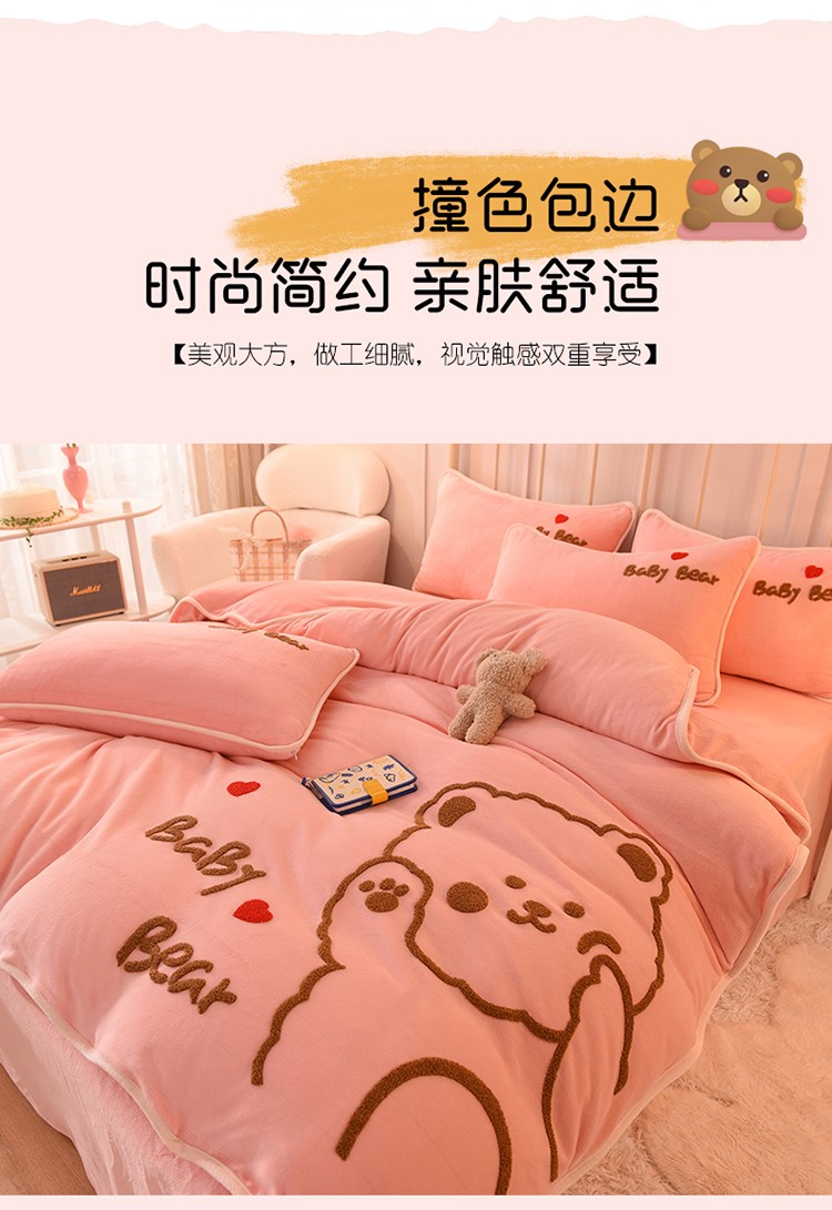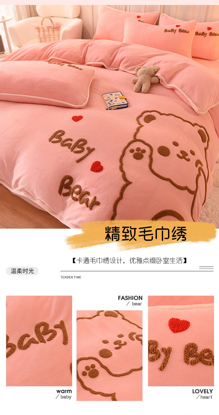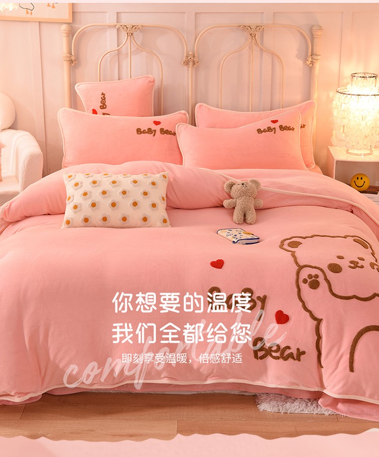 大米家居2023新款卡通毛巾绣牛奶绒宝宝绒四件套梦奇-樱花粉