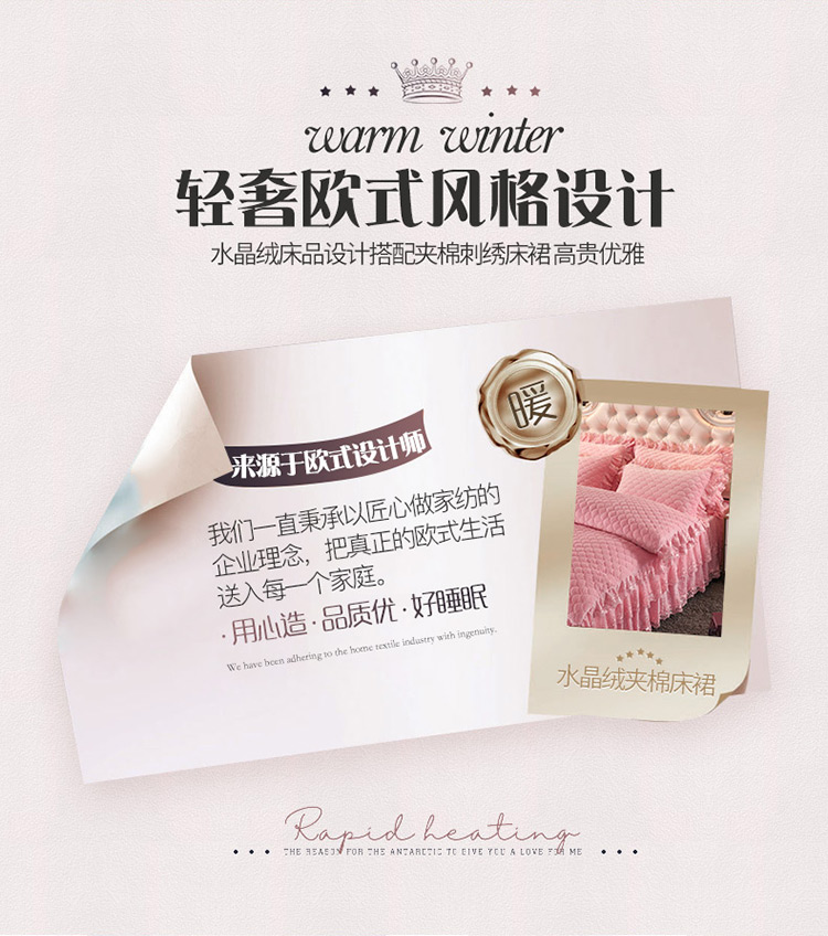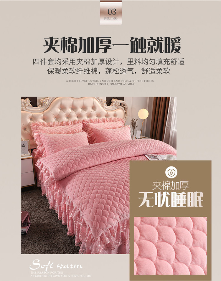 当前位置: 91家纺网 > 商品网购 > 床品套件 > 四件套 > 水晶绒四件套 > 恒爱 2022秋冬水晶绒翩翩花舞夹棉床裙四件套 美人玉