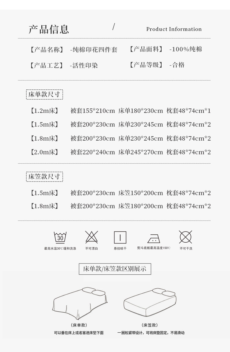 床笠款1.5米床;被套尺寸200*230,床笠150*200cm 枕套74*48*2 | ¥130.00 |