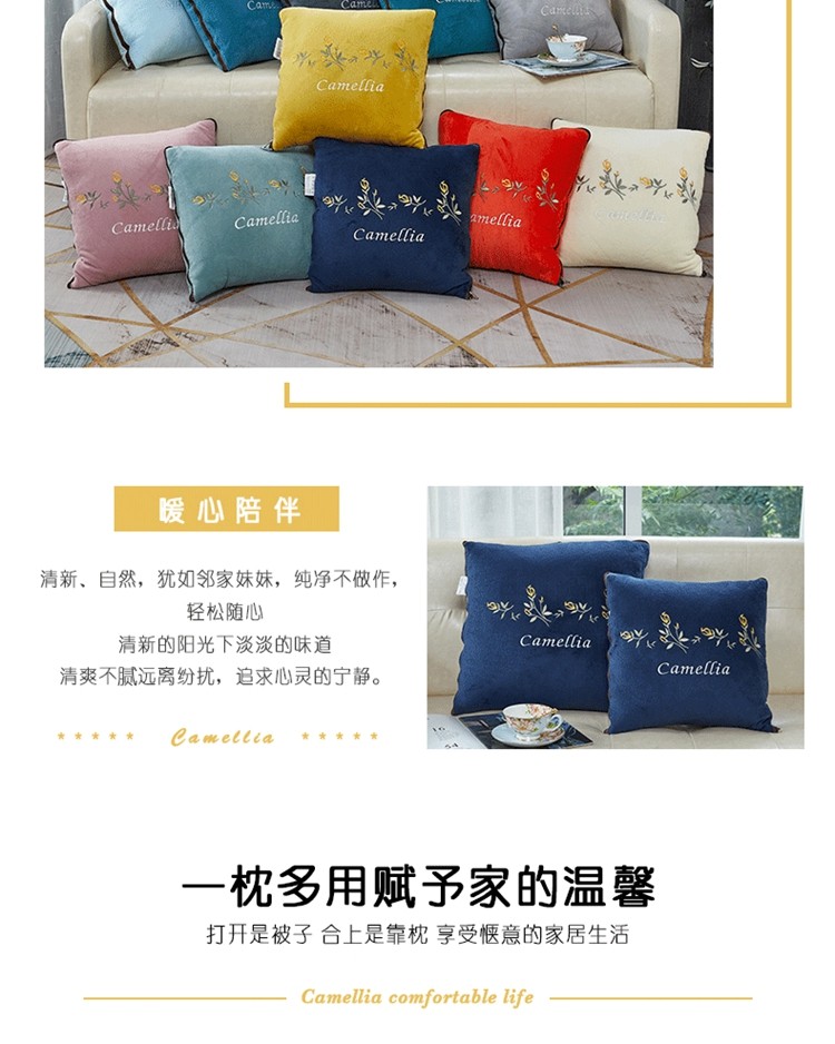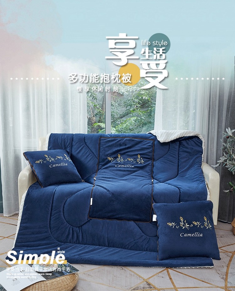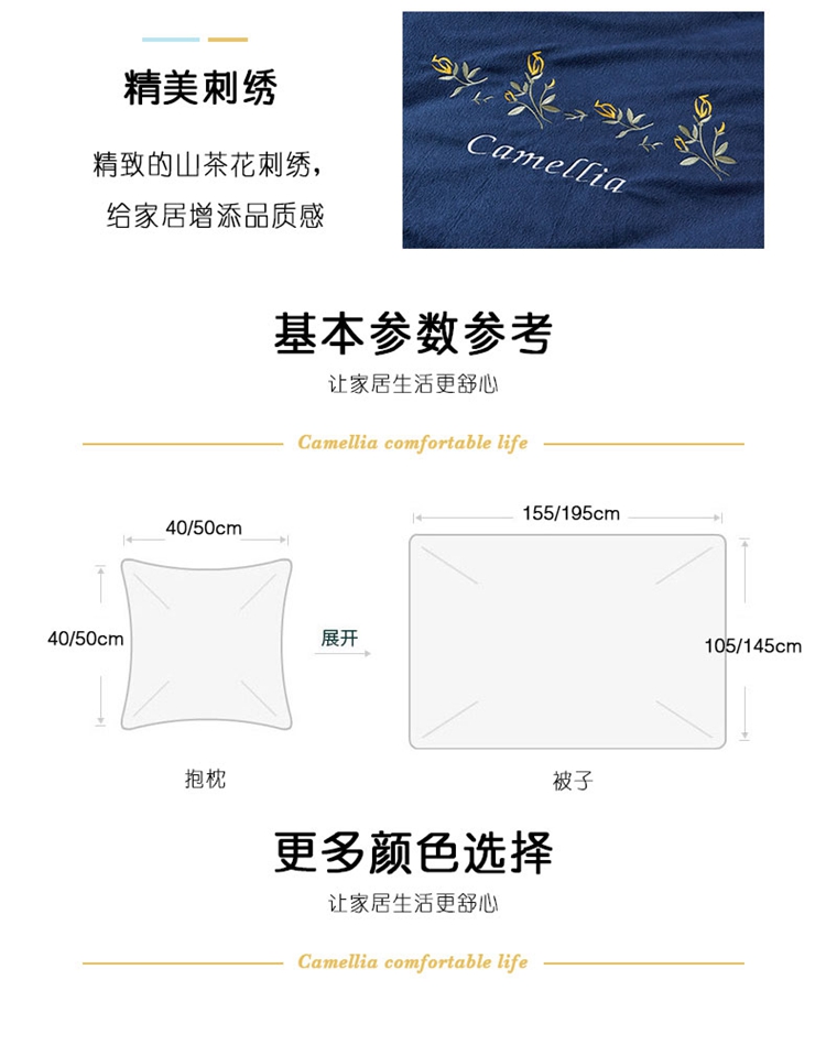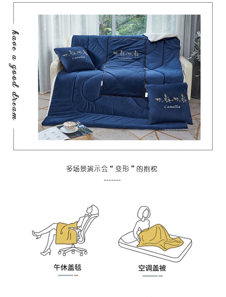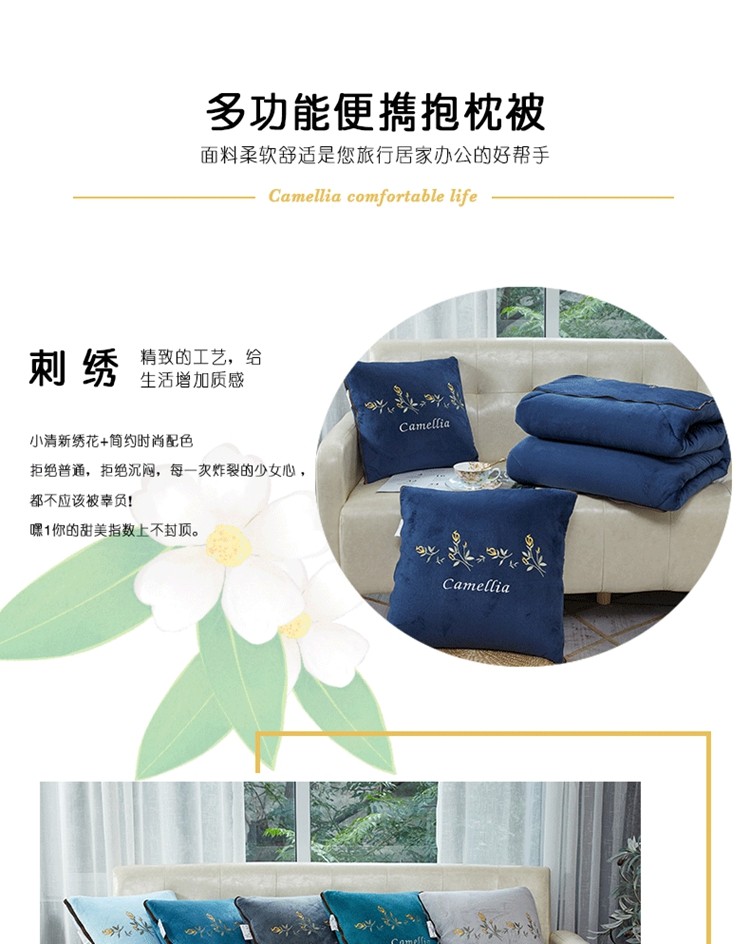 商品名称:翰轩家居 2022新款水晶绒绣花抱枕被系列-山茶花开 藏青