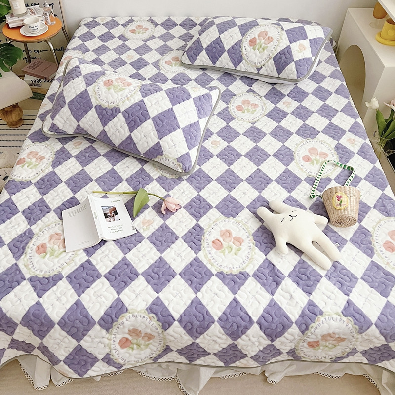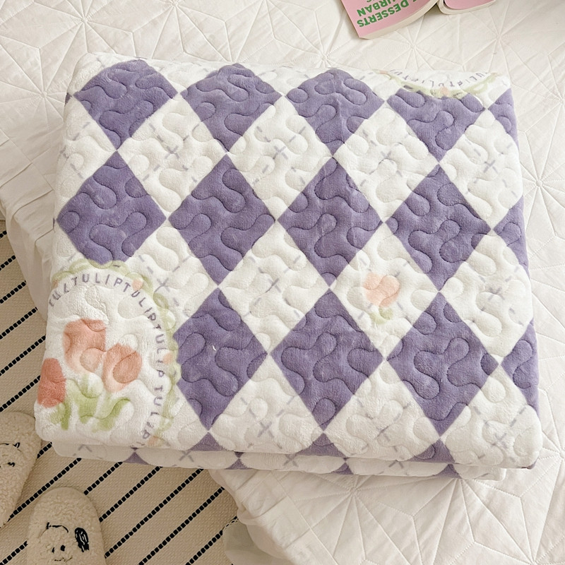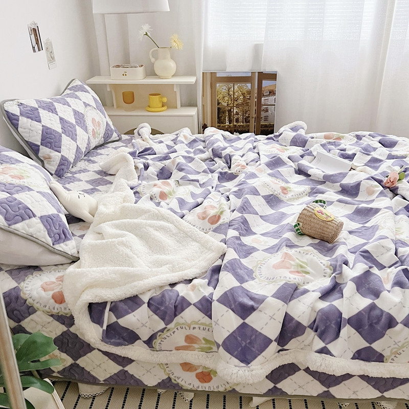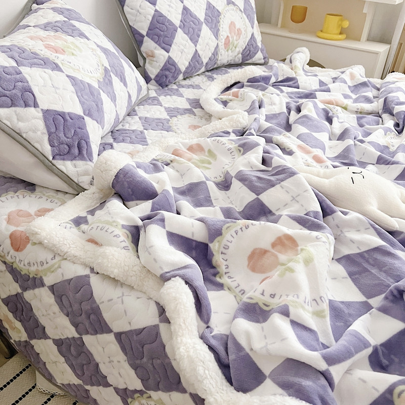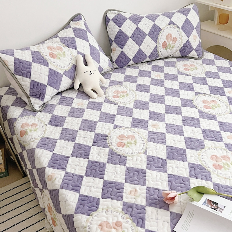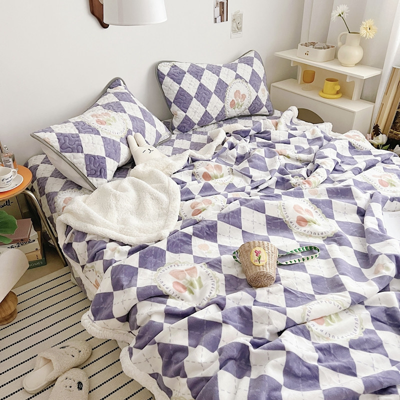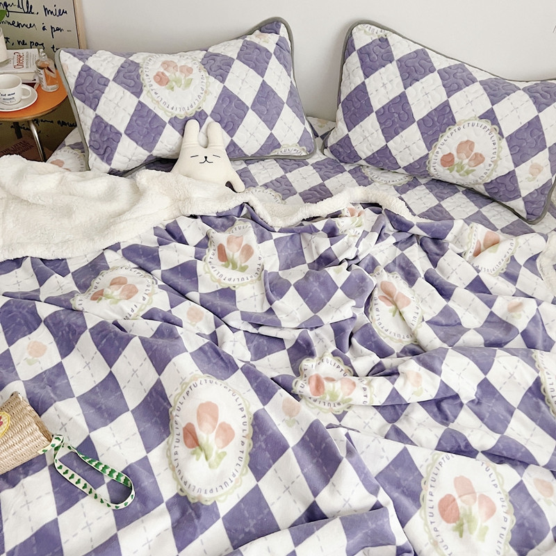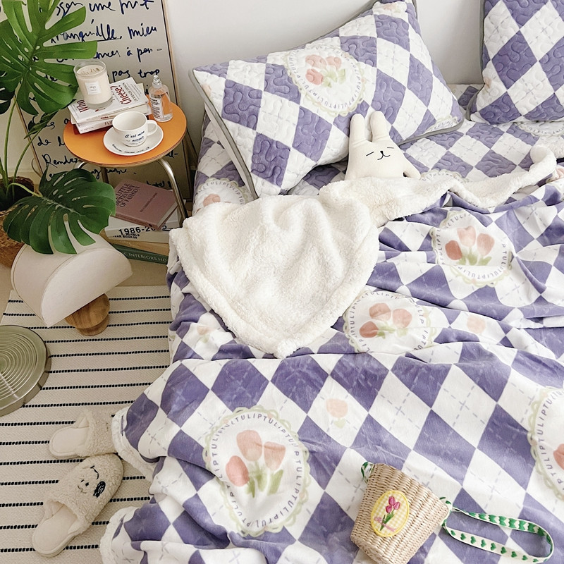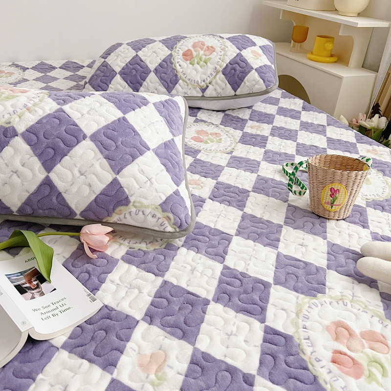 美乐迪 2022新款多功能牛奶绒亲肤棉床盖套件 格子郁金香