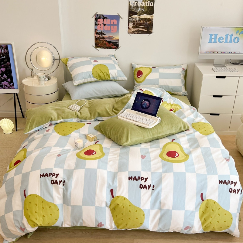 昔可 2022新款梦幻公主风系列棉加绒印花四件套 蓝棋盘绿果