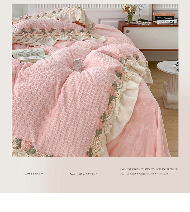 商品名称:玛奇朵 高定蕾丝边全消光云芙暖绒四件套-唯 一(场景1) 唯一(粉)