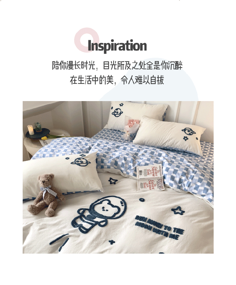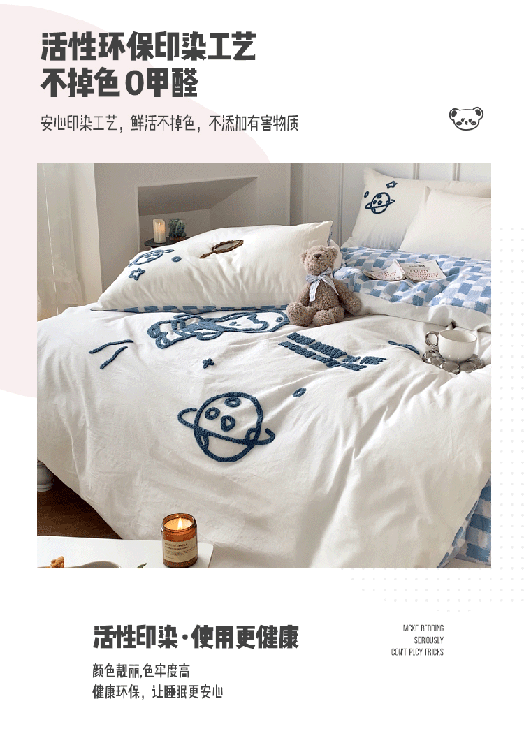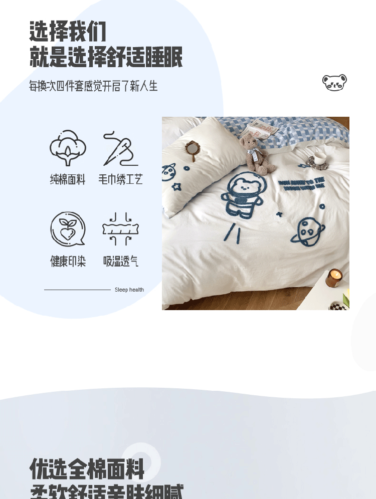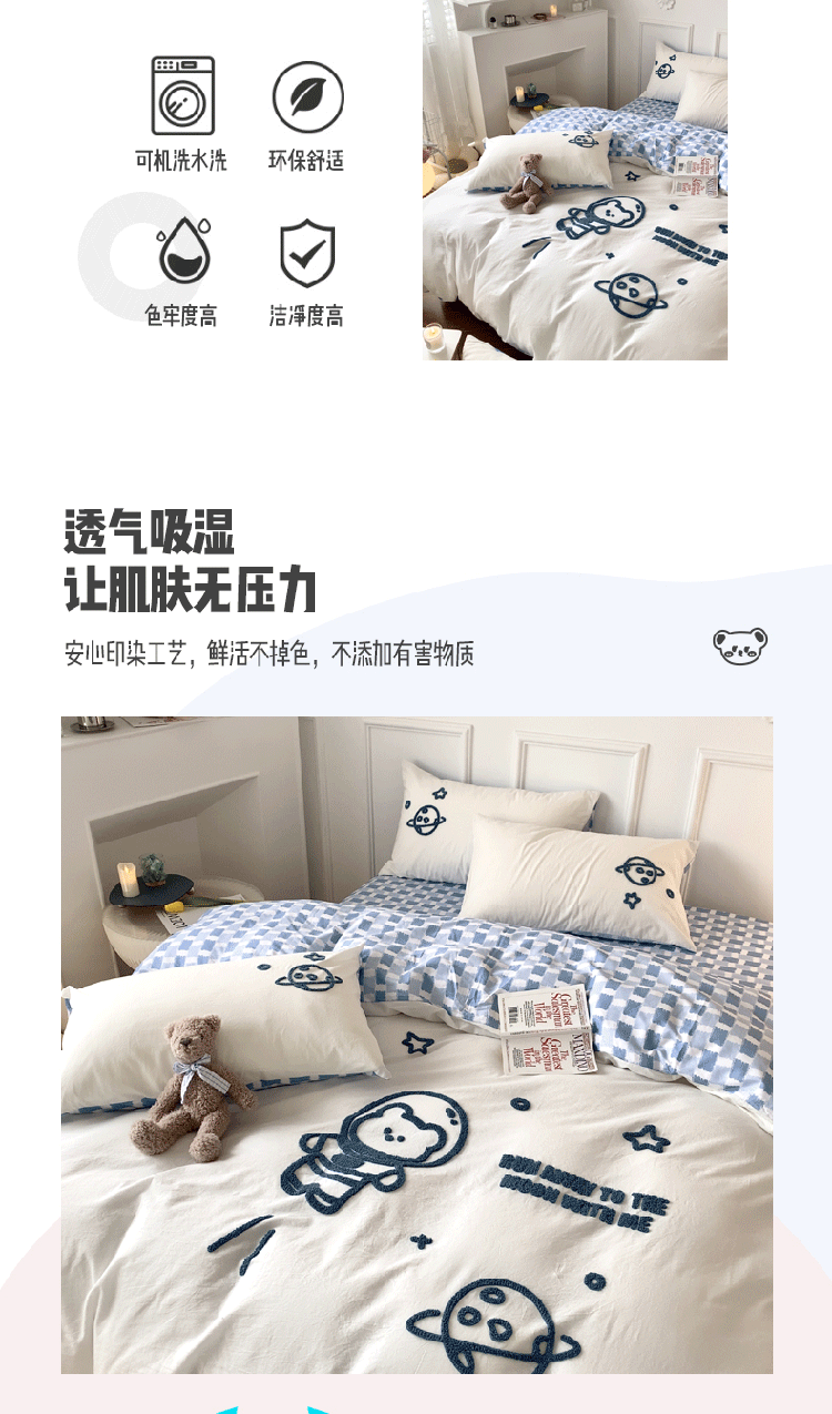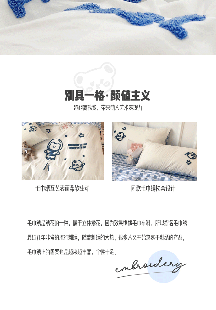 当前位置: 91家纺网 > 商品网购 > 床品套件 > 四件套 > 全棉普通四件套 > 三朵 2023新款全棉水洗棉毛巾绣花四件套 宇航小熊