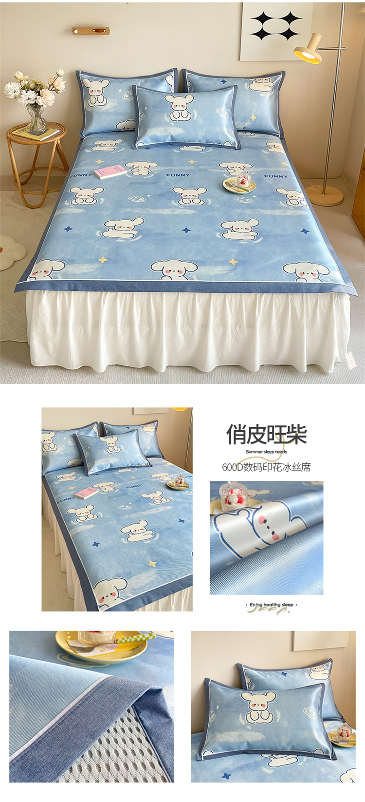 (总)懒猫家纺 2022新款学生宿舍冰丝数码印花凉席,尔雅,粉小兔,花韵,萝卜兔,清晨,手绘爱心,探索星球,甜心,小鲸鱼,小熊仔,元气兔
