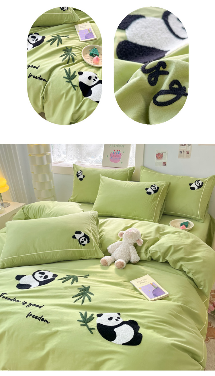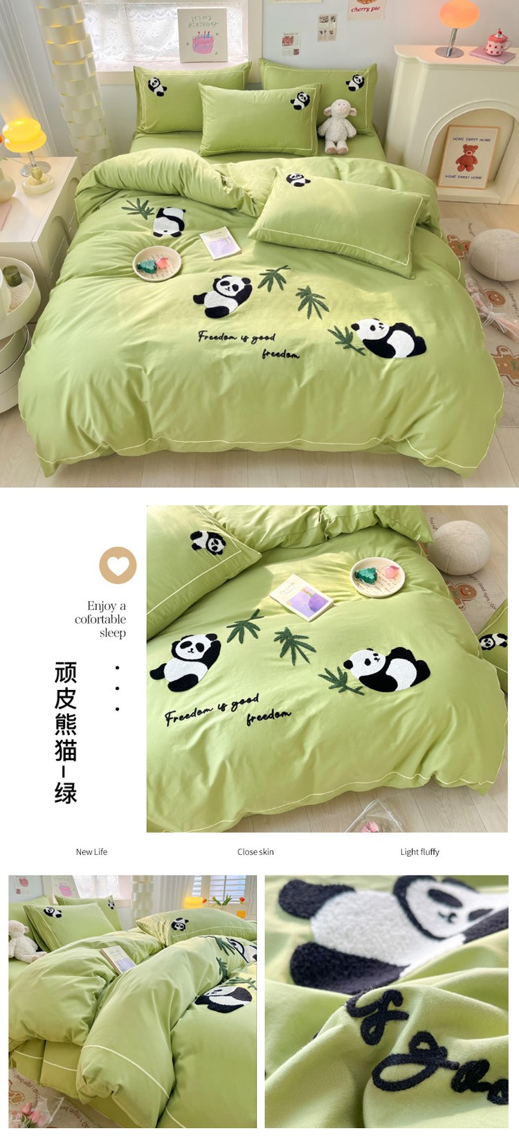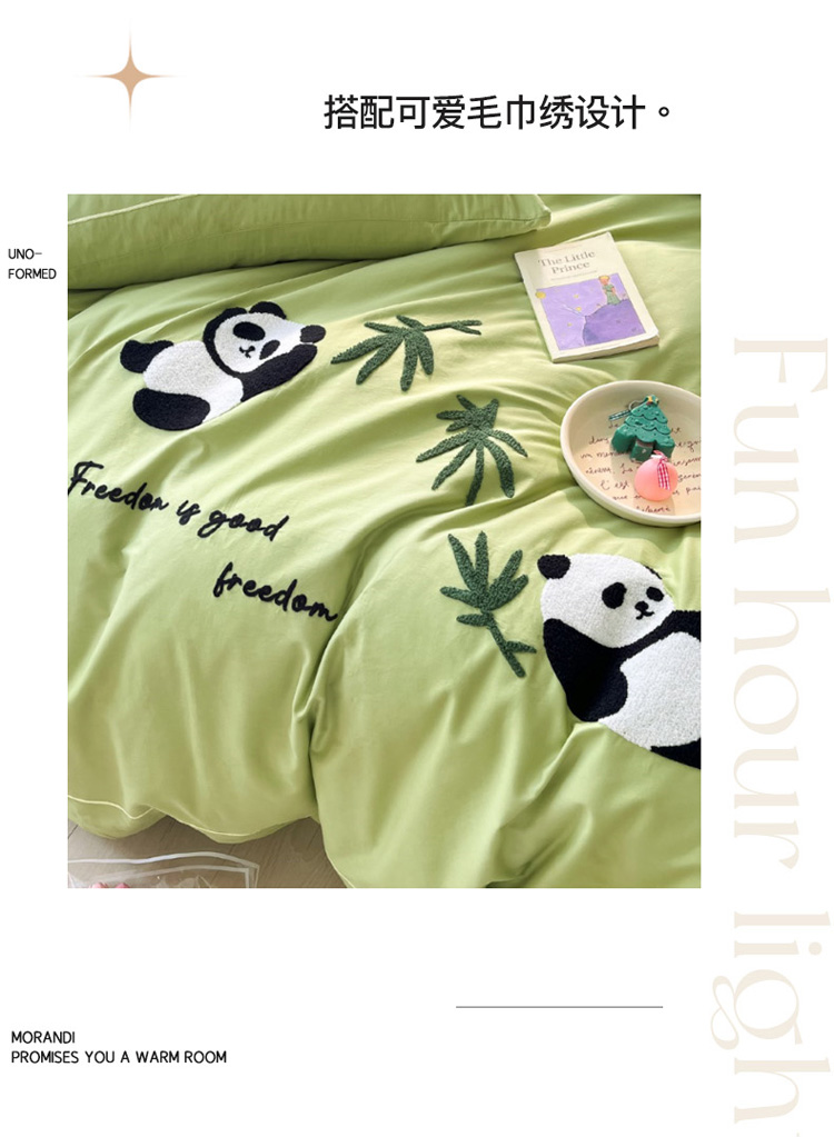 丽涵家纺2024新款全棉13376毛巾绣顽皮熊猫系列四件套顽皮熊猫-绿