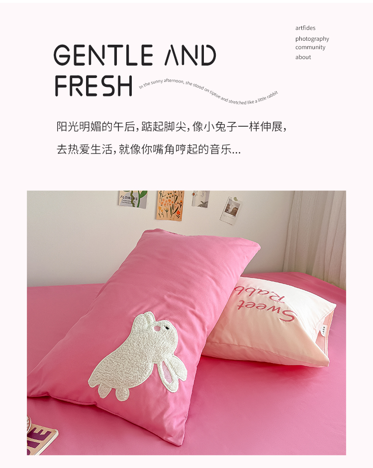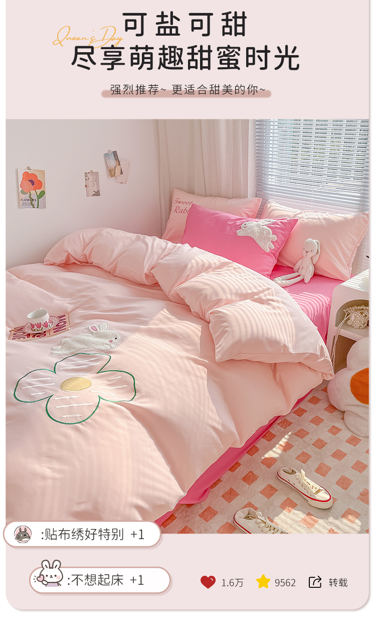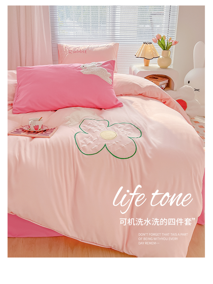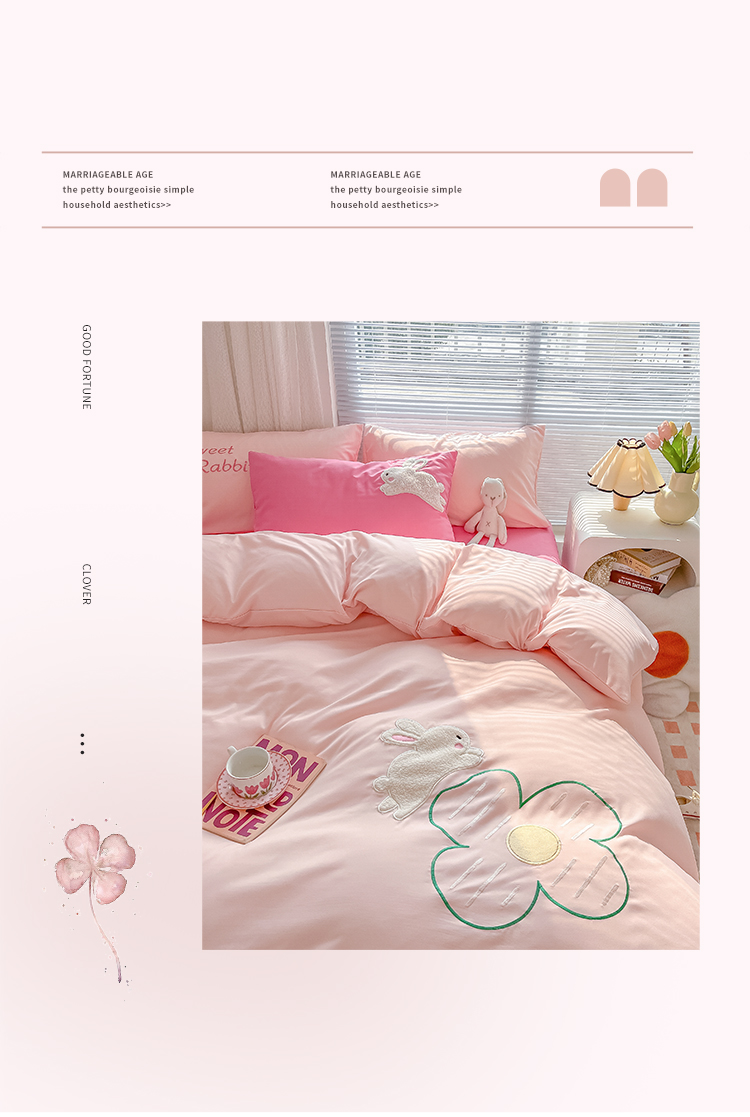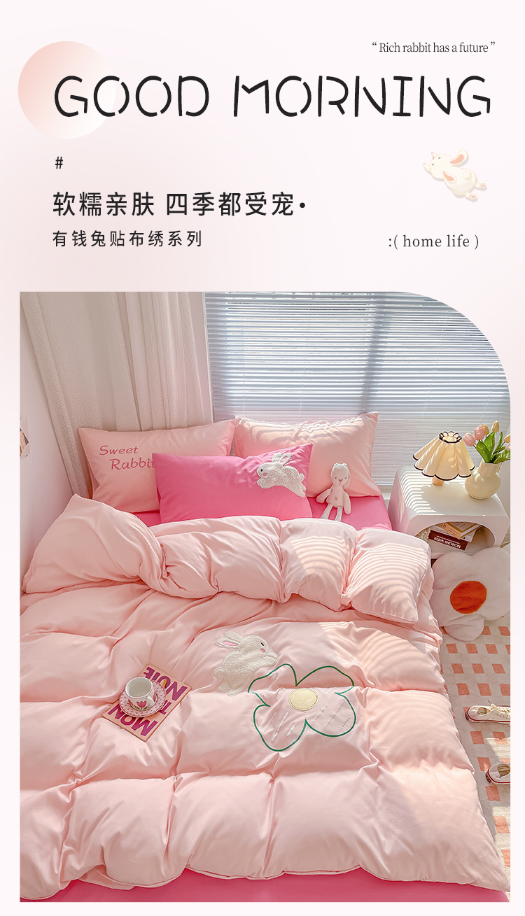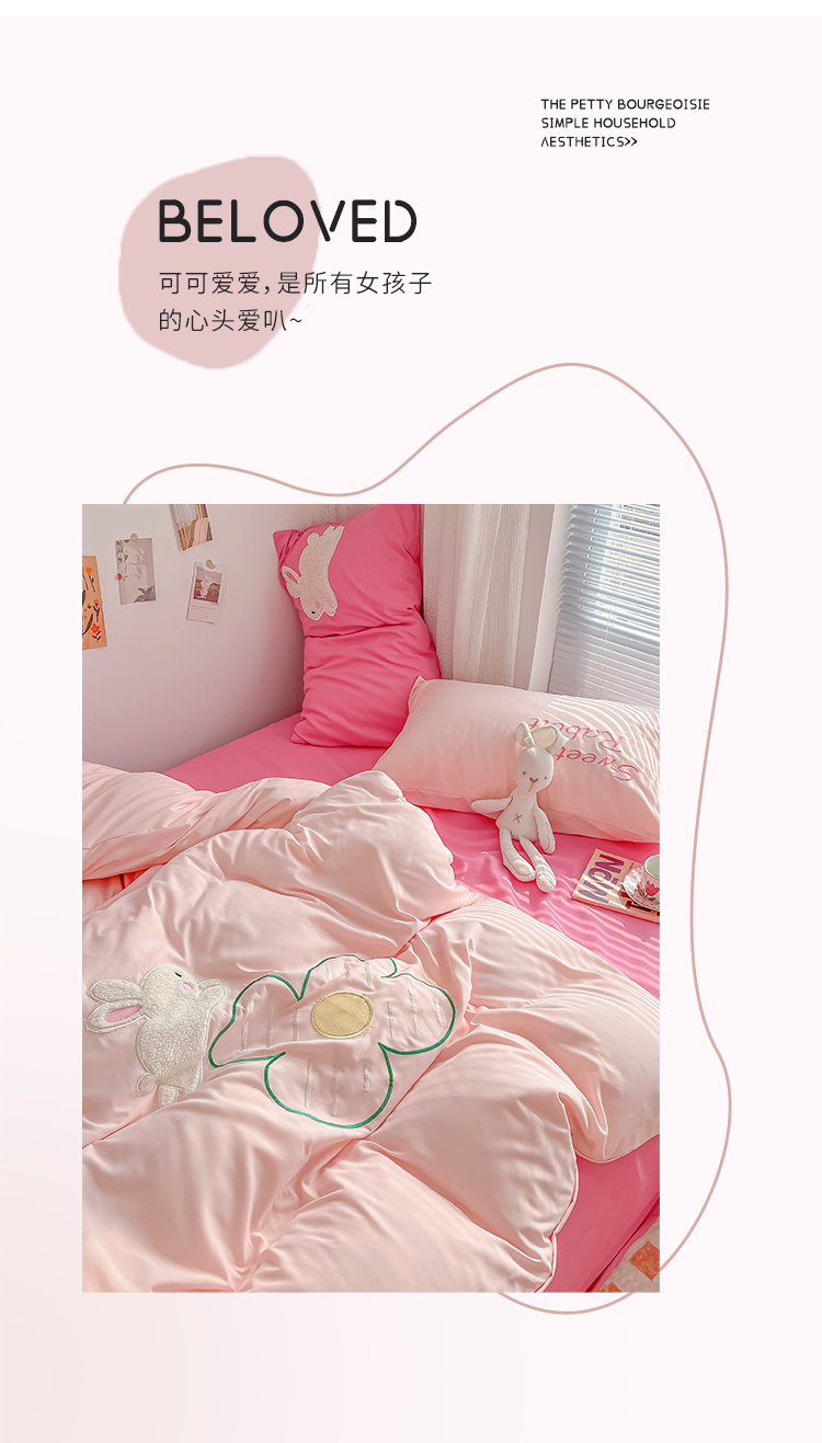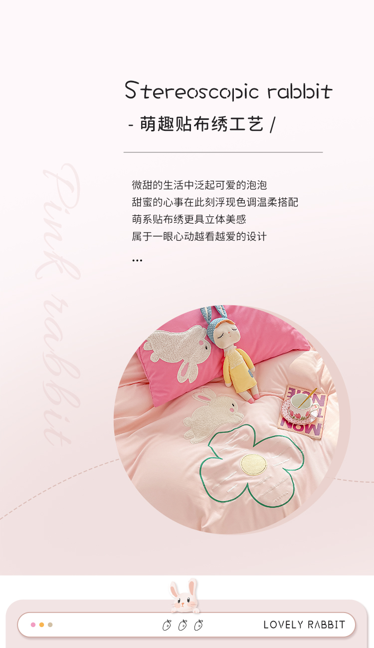 当前位置: 91家纺网 > 商品网购 > 床品套件 > 四件套 > 化纤普通四件套 > 尤米 2023新款亲肤萌趣贴布绣工艺有钱兔撞色四件套 有钱兔-浅粉