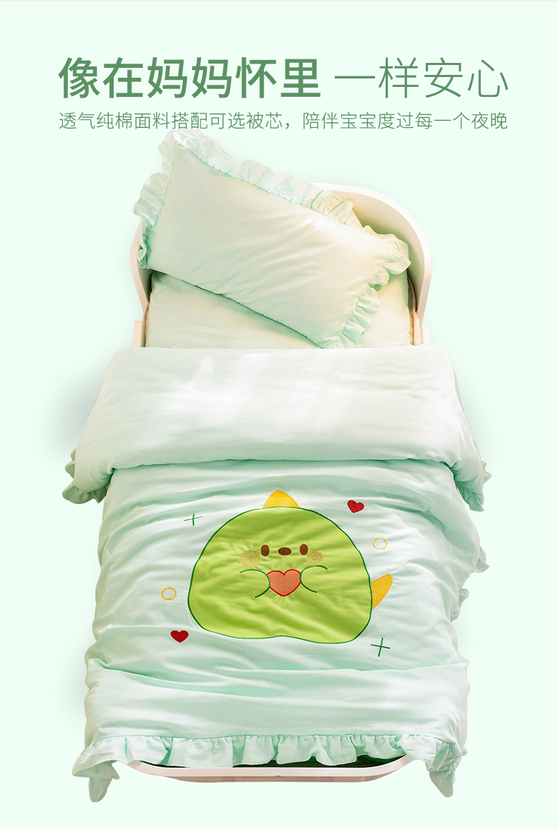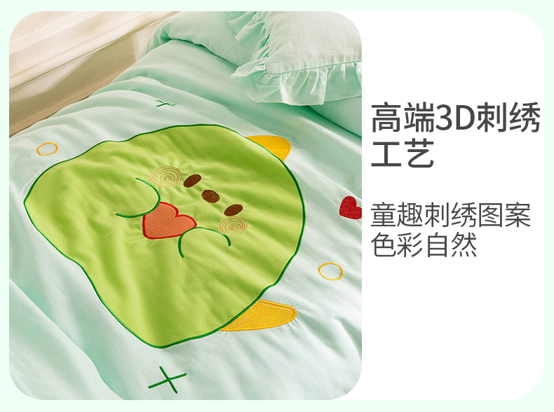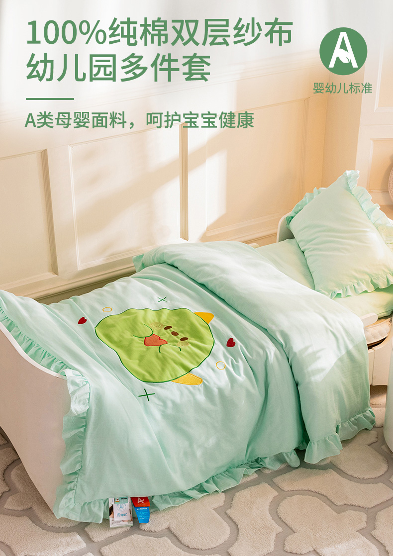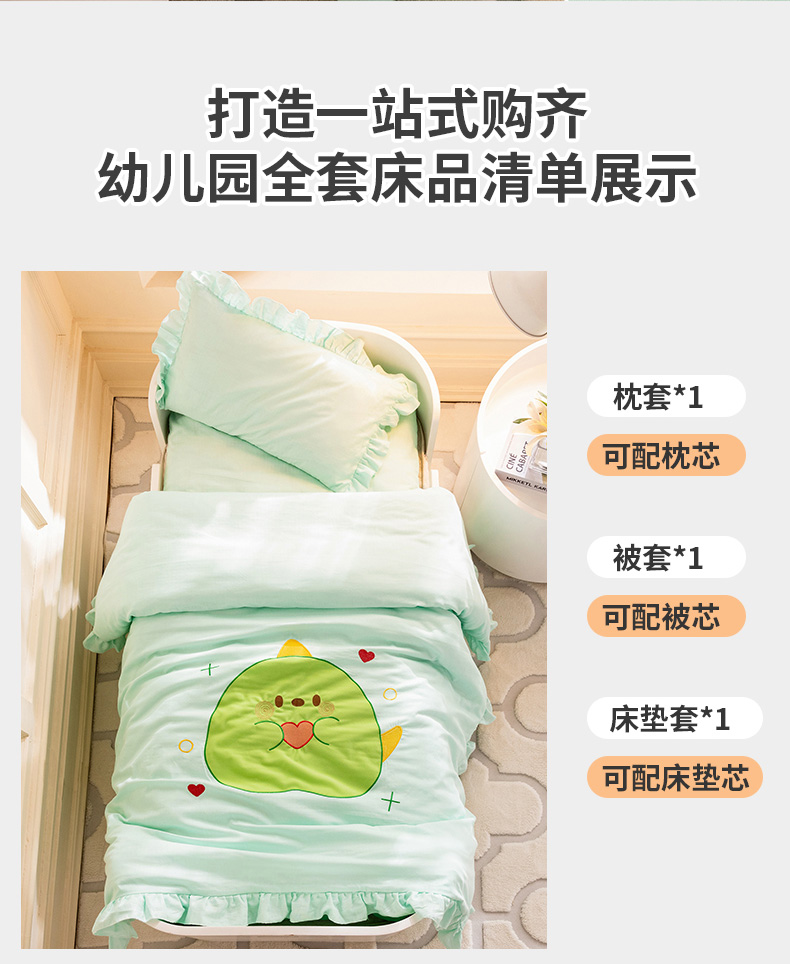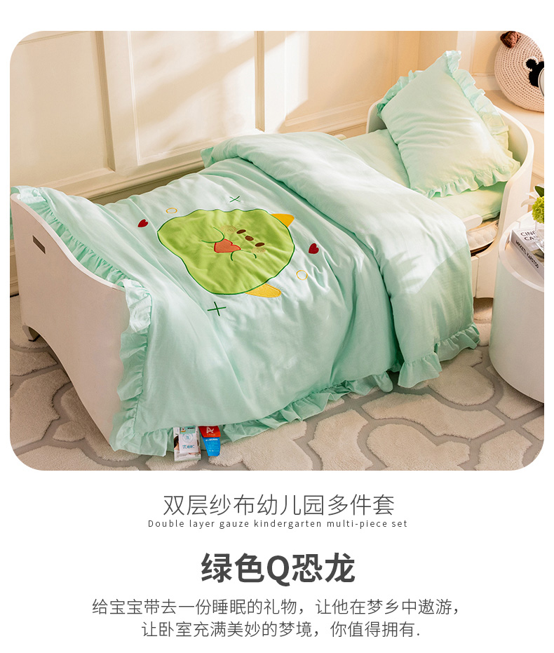 当前位置: 91家纺网 > 商品网购 > 床品套件 > 三件套 > 喜多兔 2023新款纯棉双层纱绣花幼儿园三件套 绿色Q恐龙