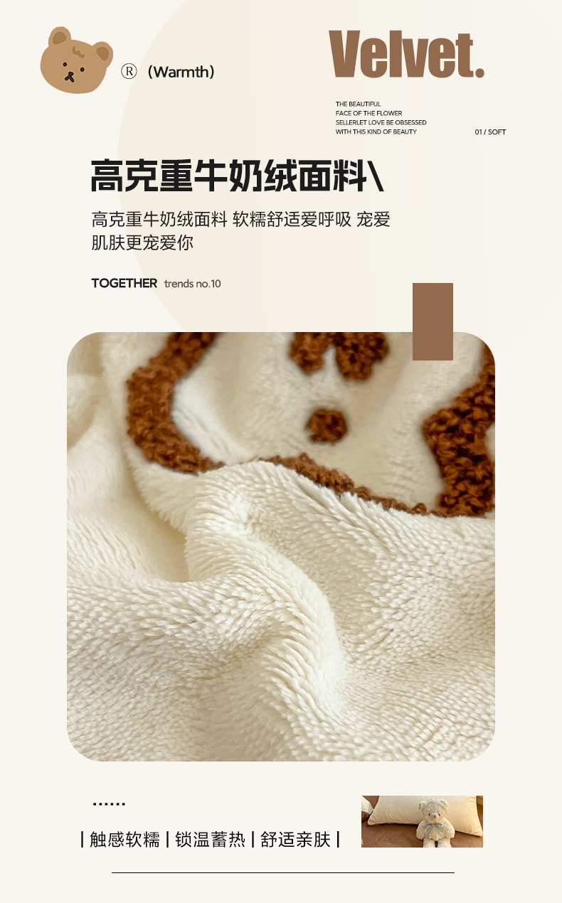 雅居纺 2023新款200克毛巾绣牛奶绒四件套-小熊米奇系列 小熊-白咖