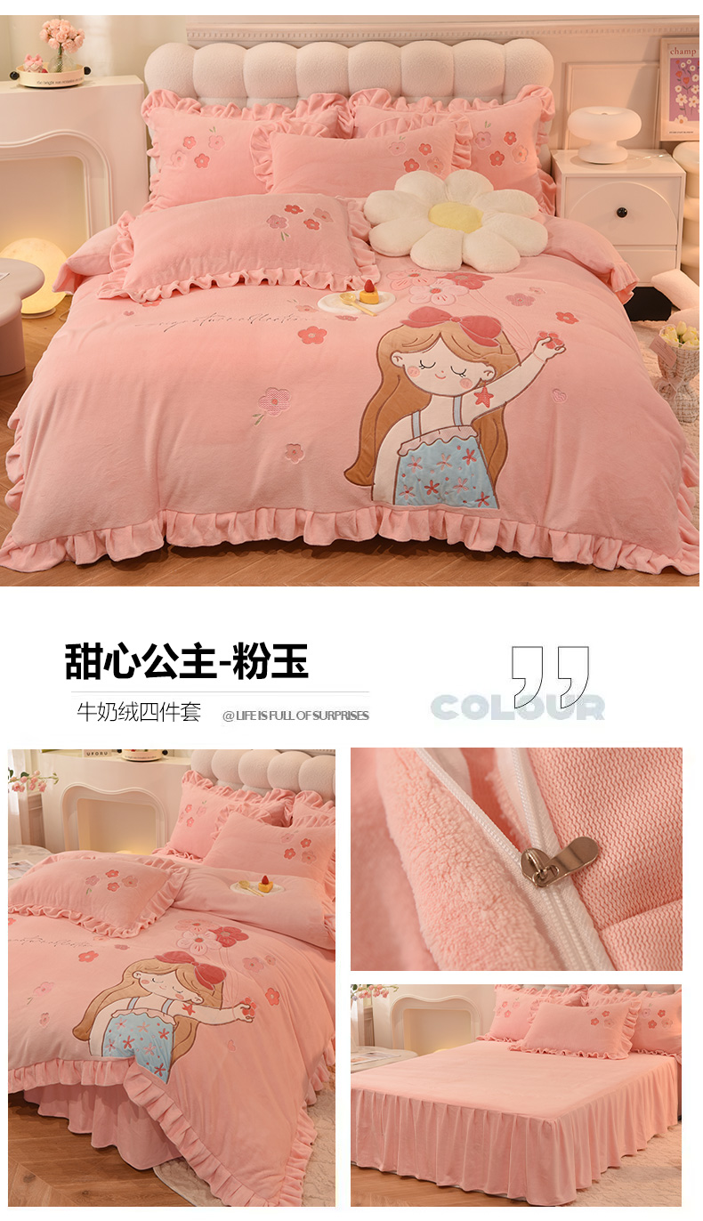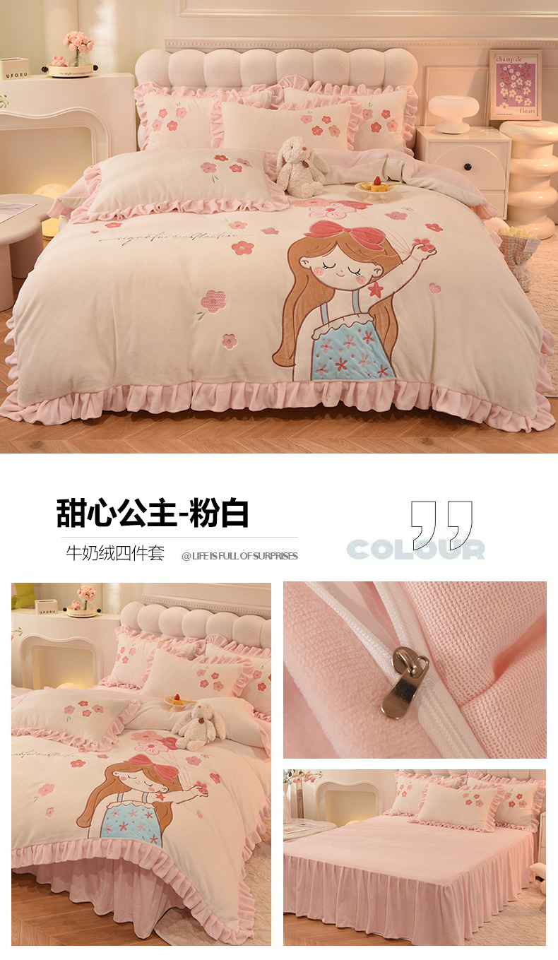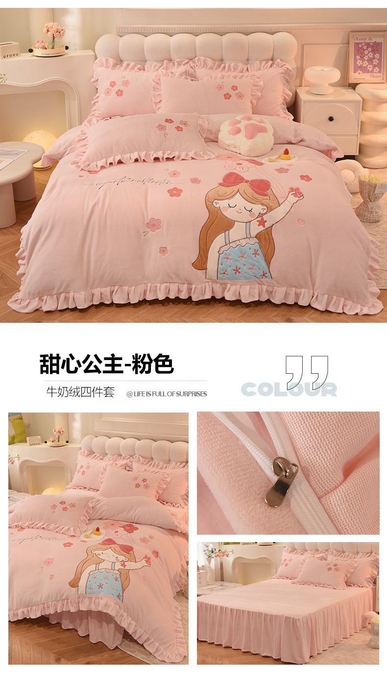 (总)丝印良品 2023新款高档贴布绣甜心公主牛奶绒四件套