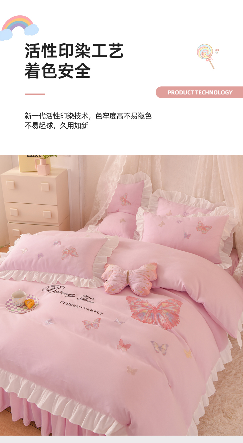 当前位置: 91家纺网 > 商品网购 > 床品套件 > 四件套 > 化纤普通四件套 > 丝印良品 2023新款秋冬保暖云锦棉刺绣花边羽蝶系列四件套 羽蝶-粉色
