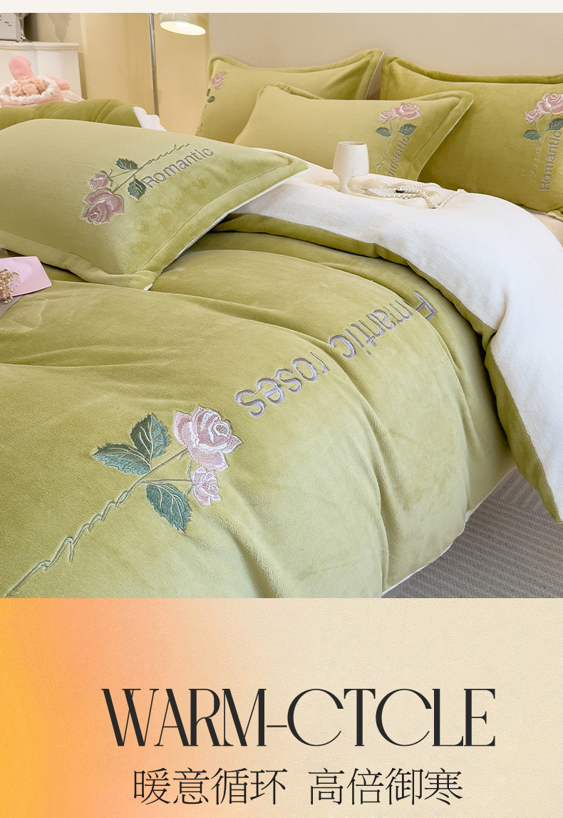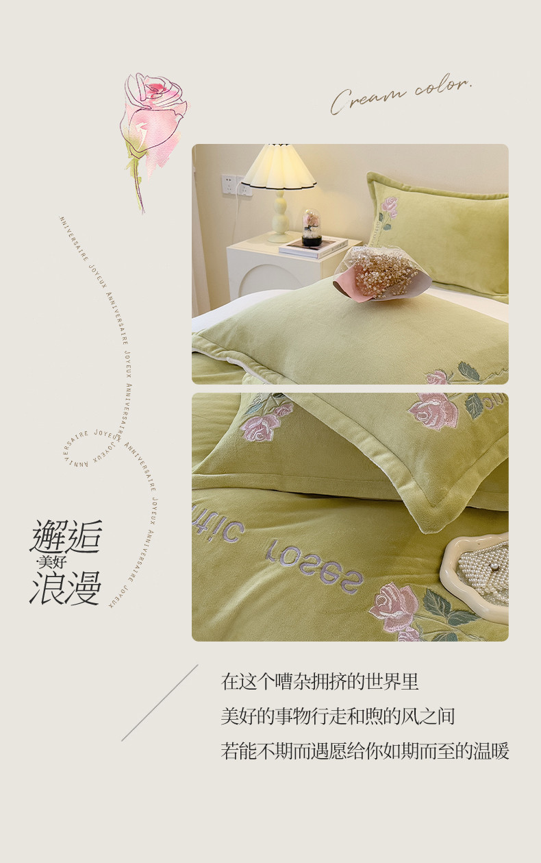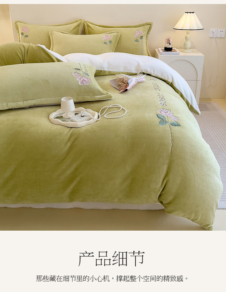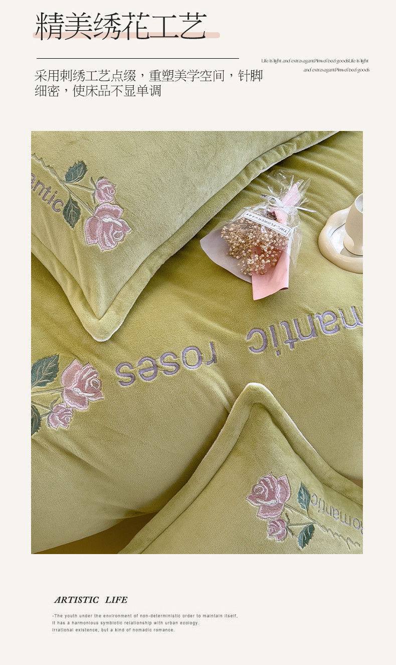 悦织语 2024新款200克高克重牛奶绒刺绣四件套-玫瑰 玫瑰-抹茶绿