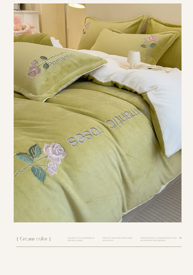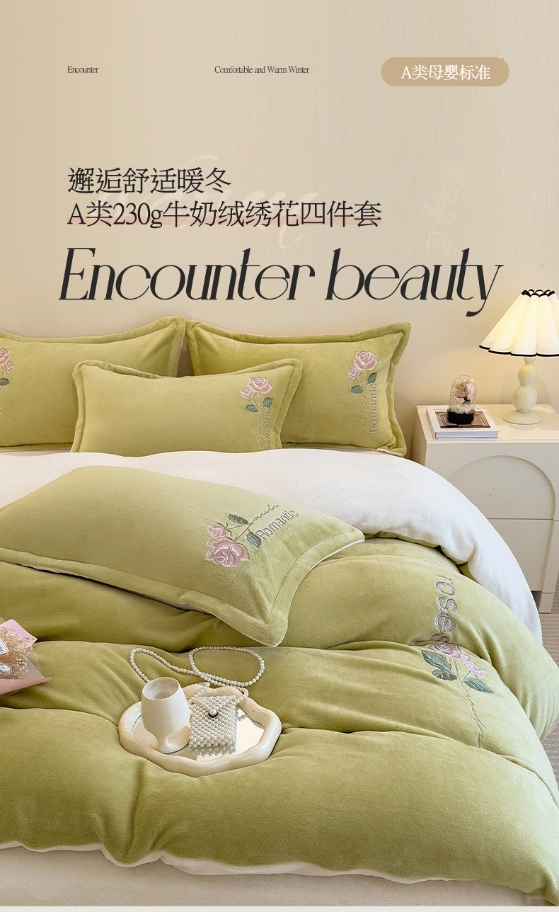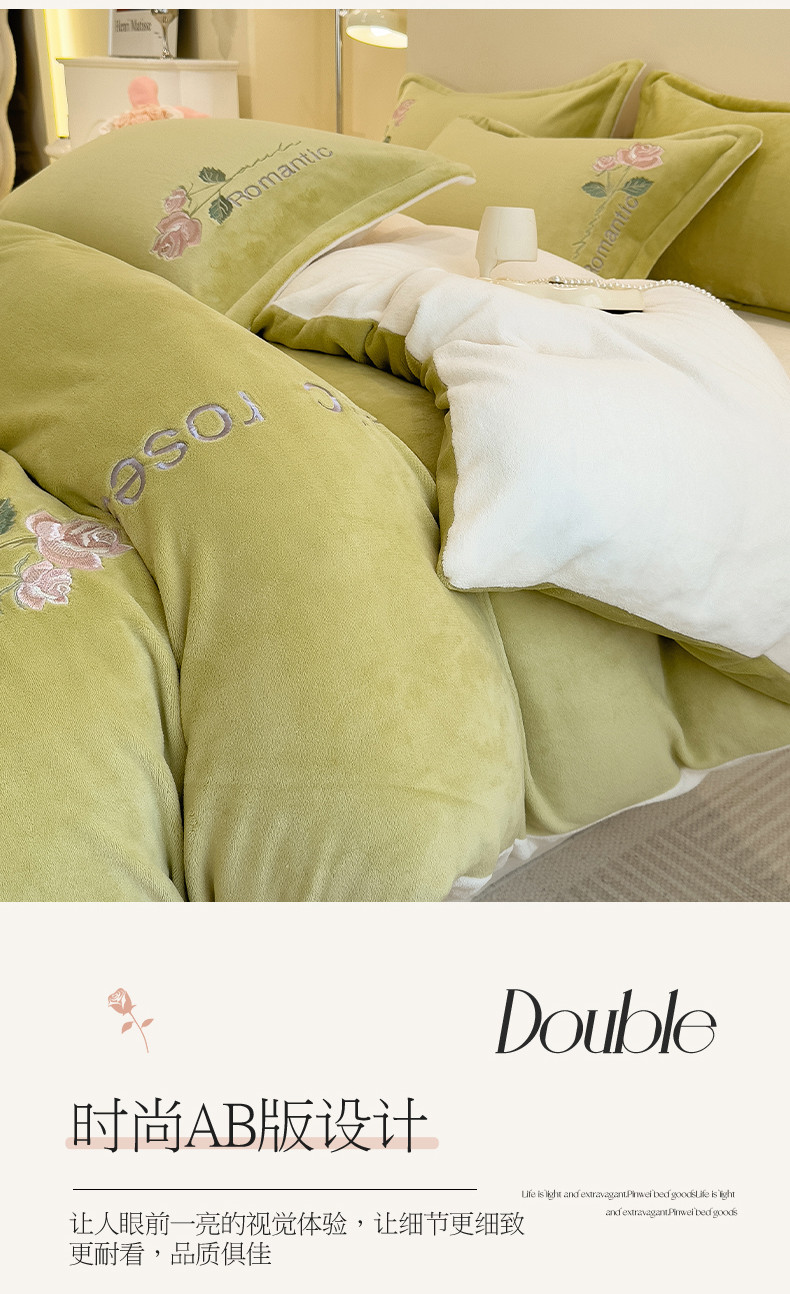 悦织语 2024新款200克高克重牛奶绒刺绣四件套-玫瑰 玫瑰-抹茶绿