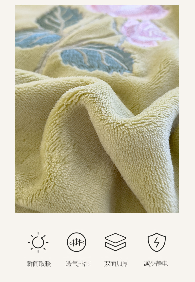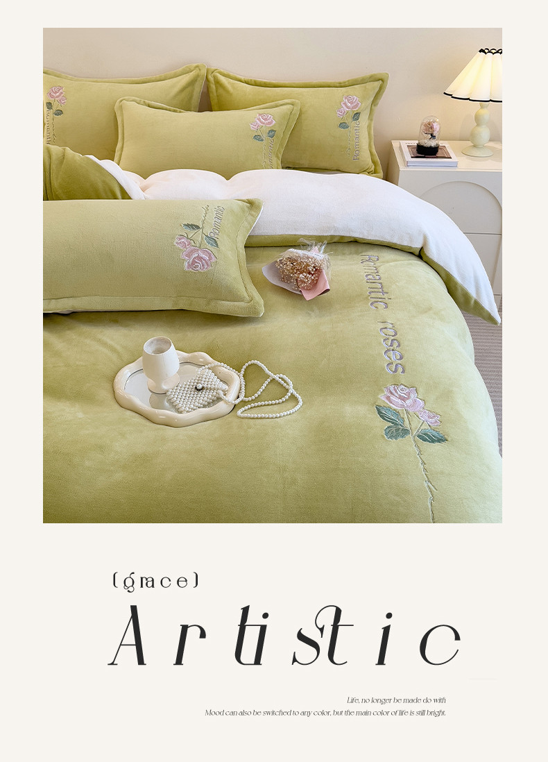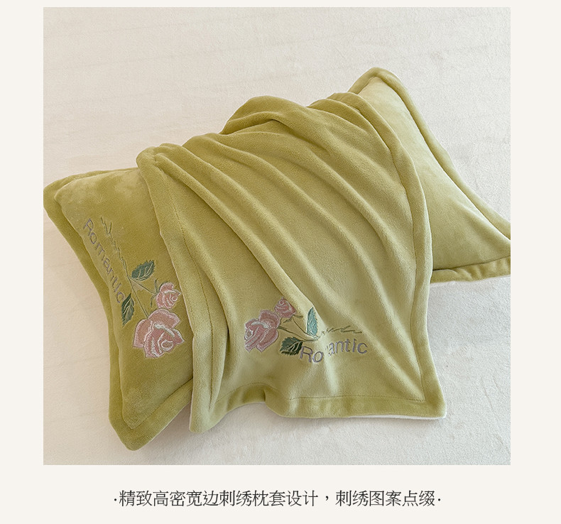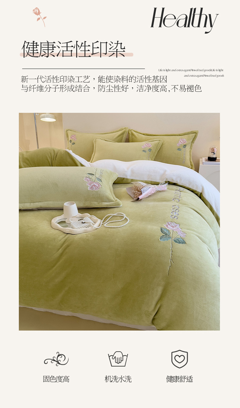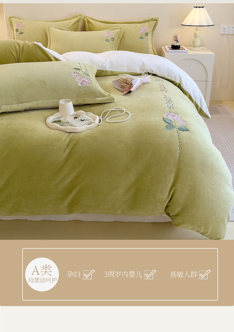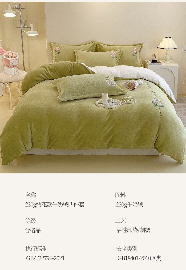 商品名称:悦织语 2024新款200克高克重牛奶绒刺绣四件套-玫瑰 玫瑰-抹茶绿