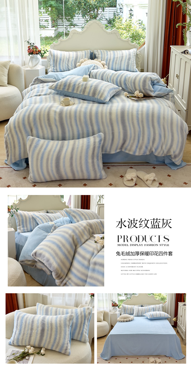 商品名称:花伞 2023新款加厚印花兔毛绒保暖四件套 水波纹蓝灰