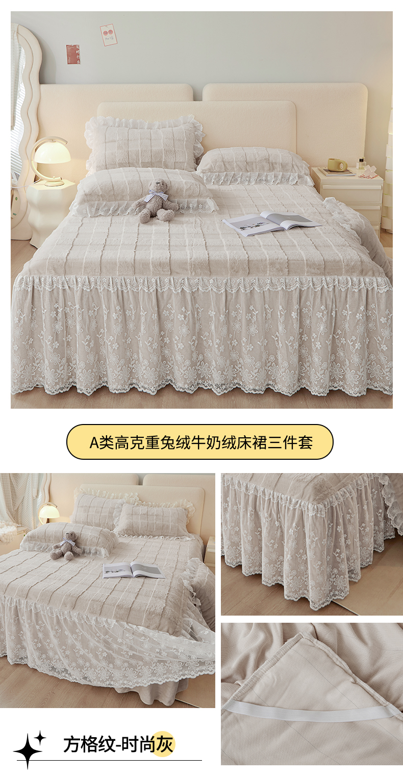 商品名称:宜凡家纺 2023新款高克重兔绒牛奶绒床裙三件套 方格纹 时尚灰