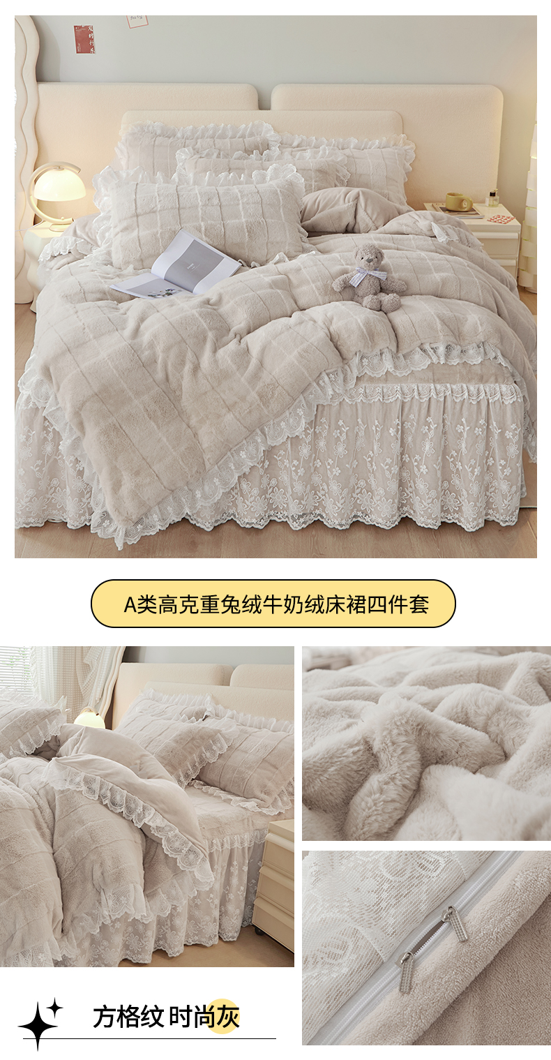 当前位置: 91家纺网 > 商品网购 > 床品套件 > 四件套 > 兔毛绒四件套 > 宜凡家纺 2023新款高克重兔绒牛奶绒床裙四件套 方格纹 时尚灰