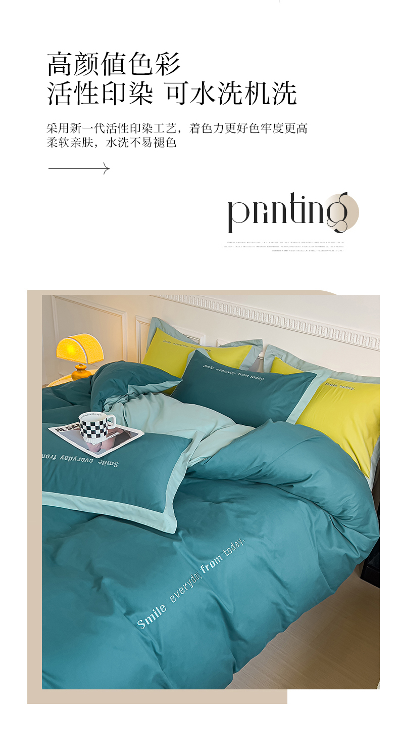 嘉汀兰 2023新款60支全棉磨毛绣花撞色轻奢四件套—暮里 深青色