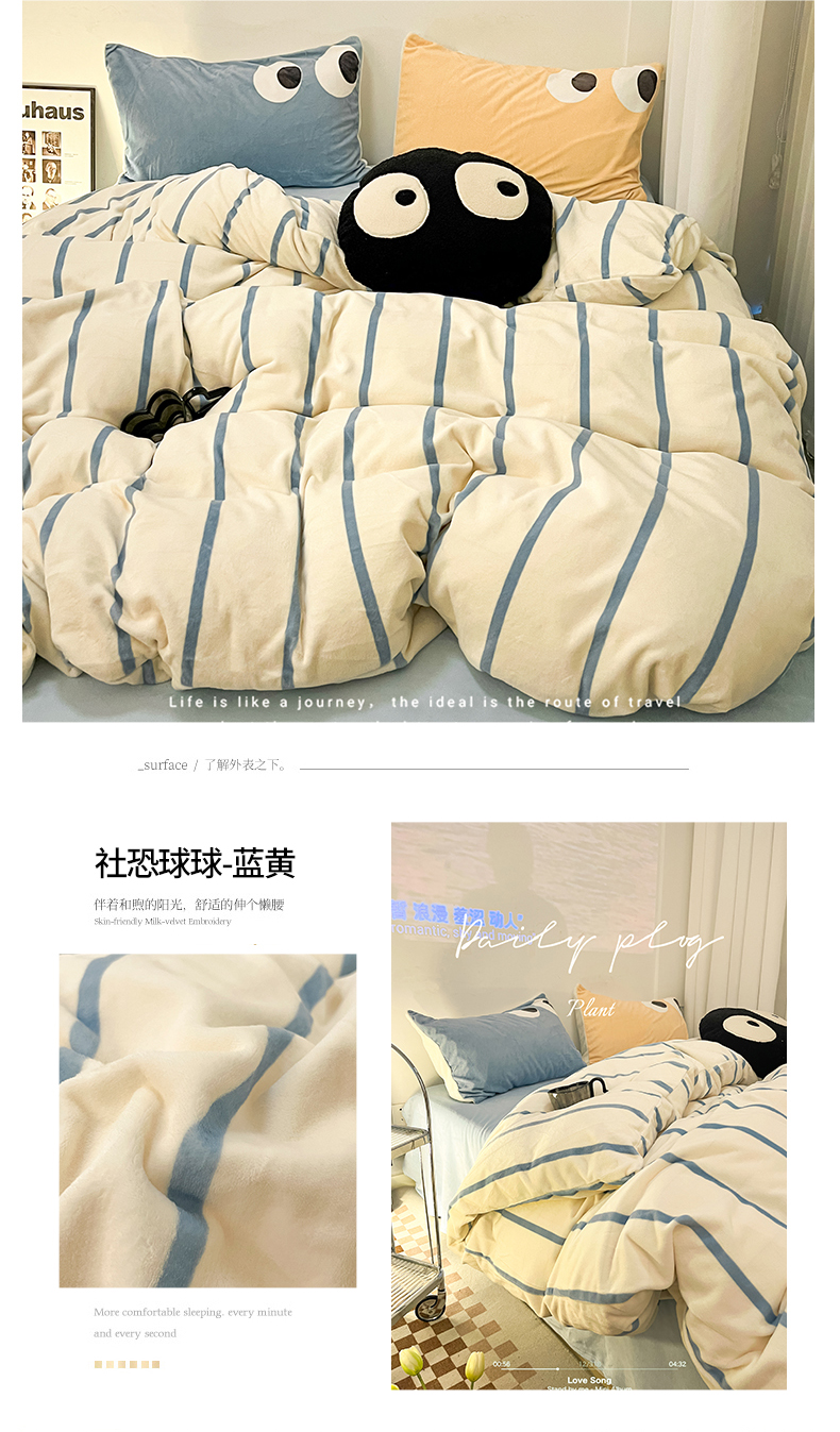 商品名称:川悦生活 2023新款条纹牛奶绒220克四件套 社恐球球-蓝黄