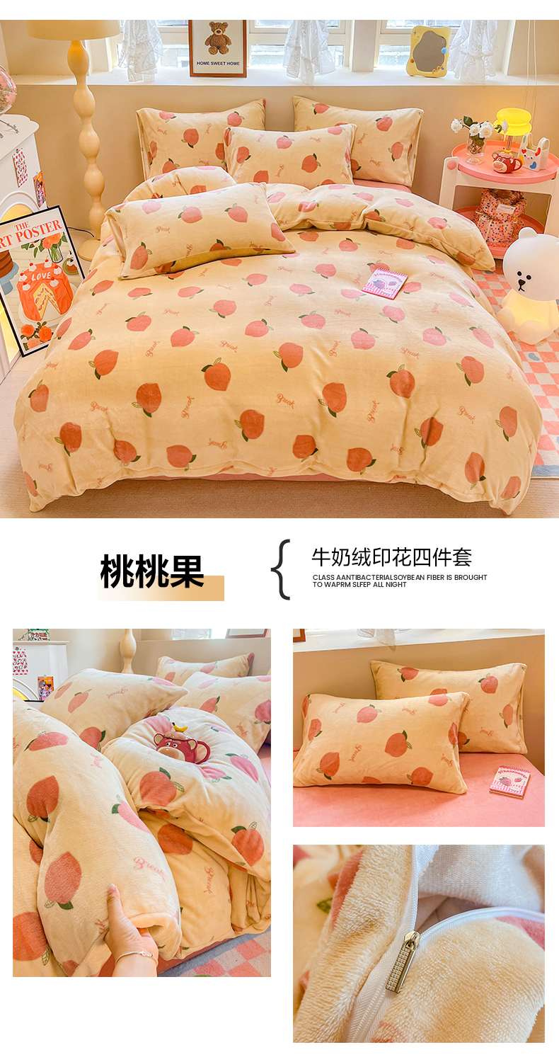 商品名称:沐辰 2023新款牛奶绒印花四件套 桃桃果