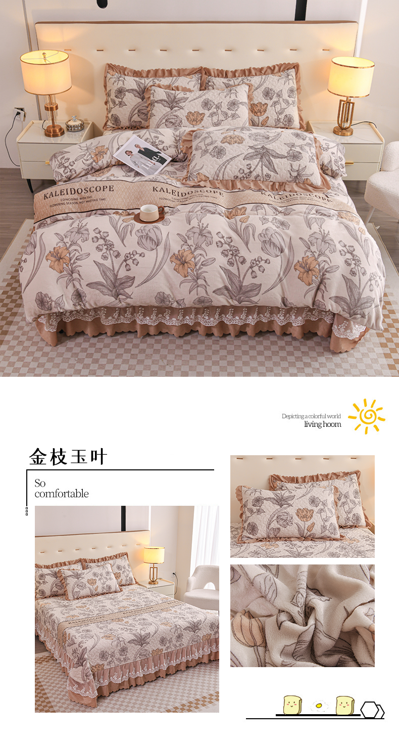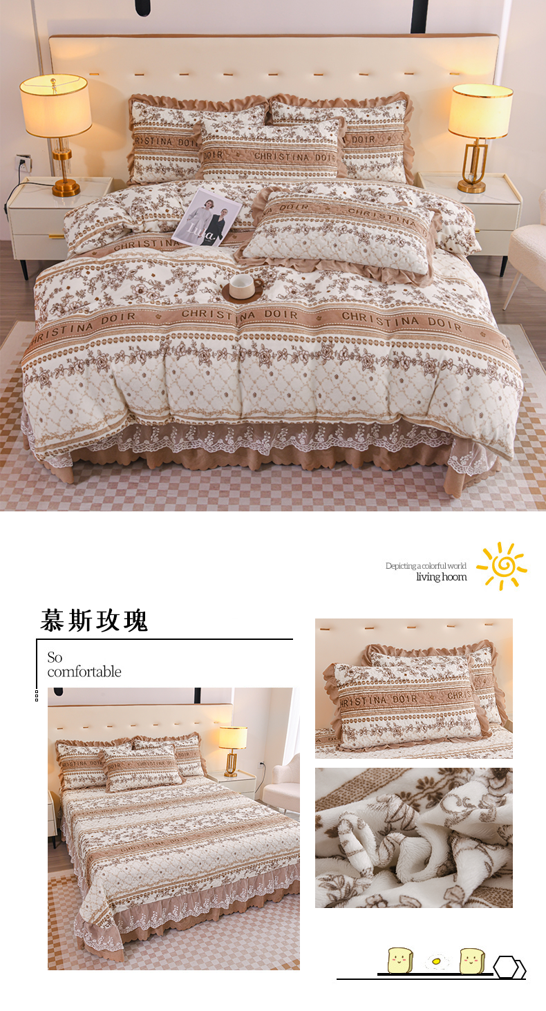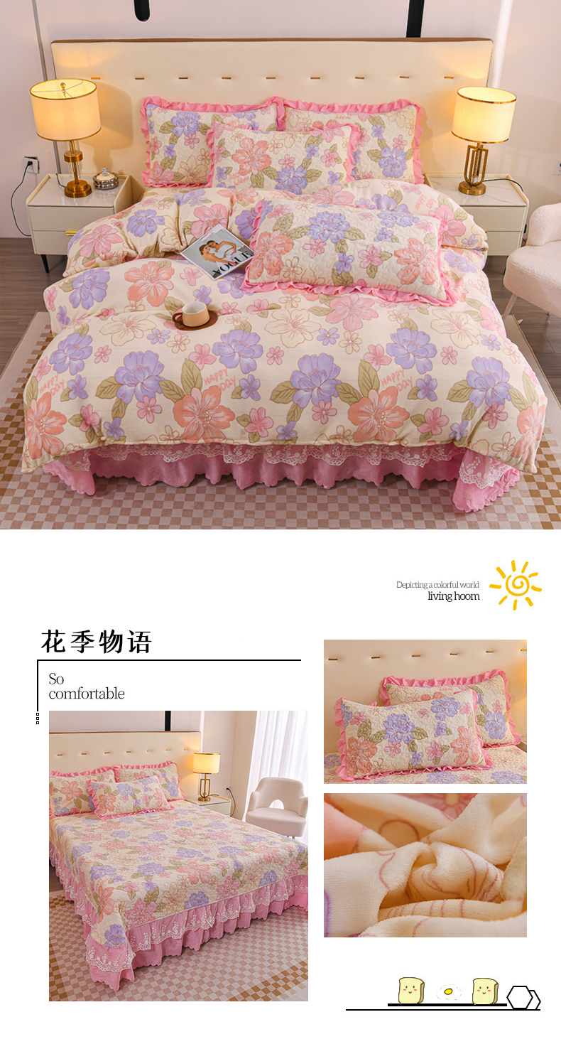 (总)雅眠居2024新款直播爆款牛奶绒印花床盖四件套双层蕾丝花边床裙单件三件套
