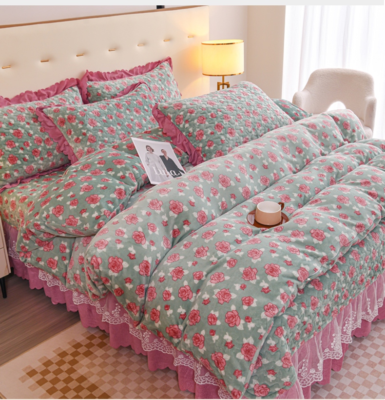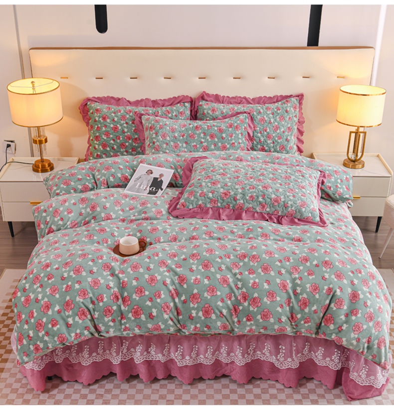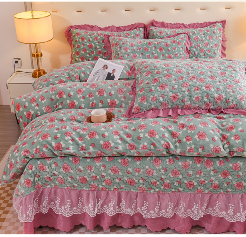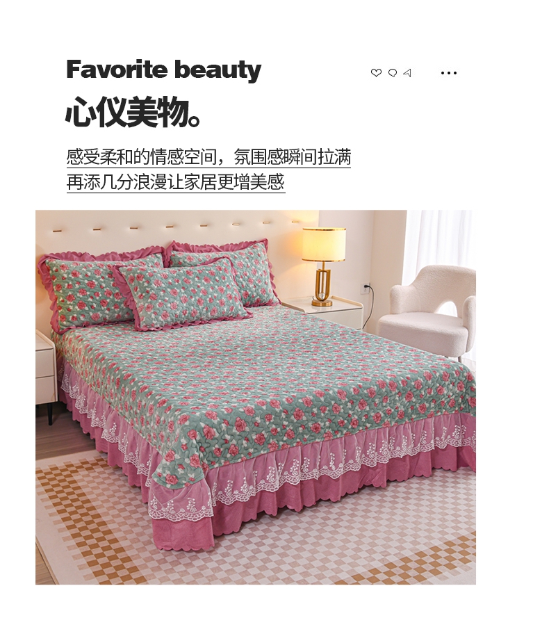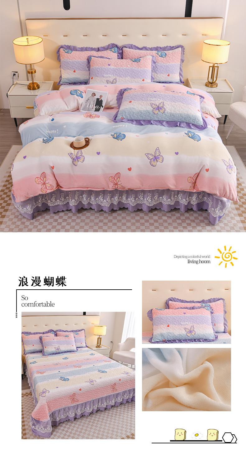 (总)雅眠居2024新款直播爆款牛奶绒印花床盖四件套双层蕾丝花边床裙单件三件套