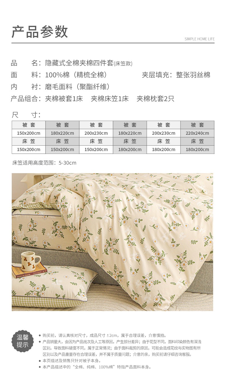 升级款夹棉被套1.8x2.2m+夹棉床笠1.8mx2.0床+夹棉枕套1对 | ¥190.00 |