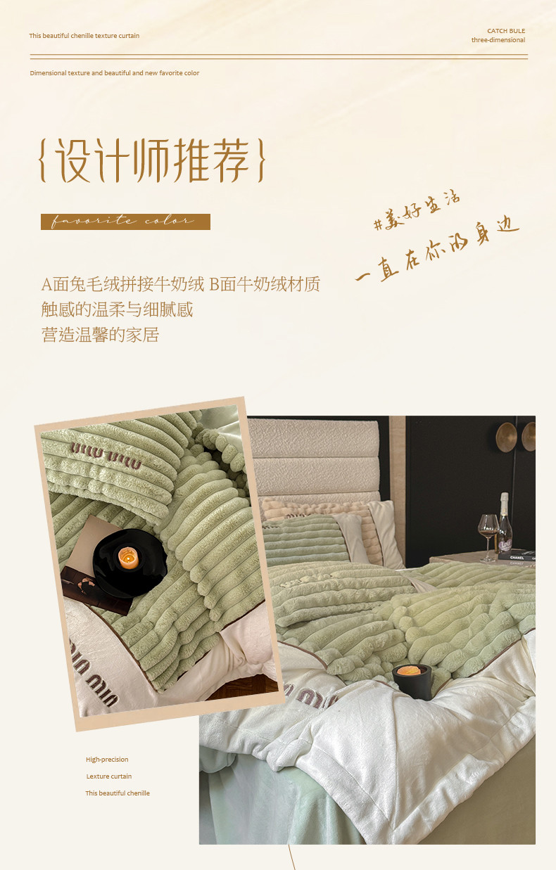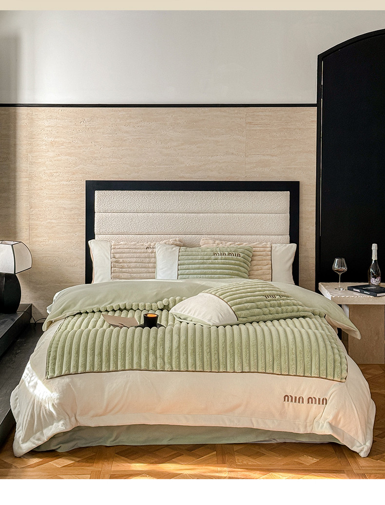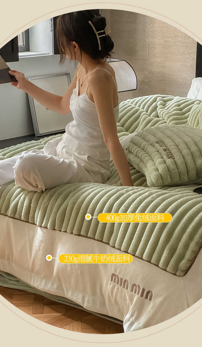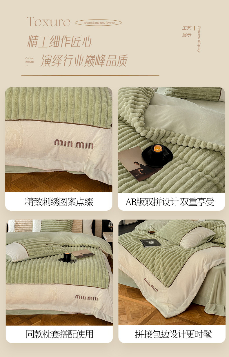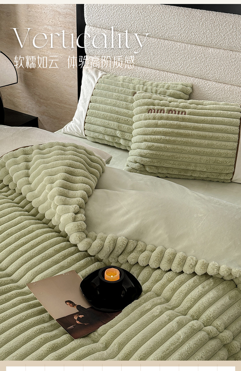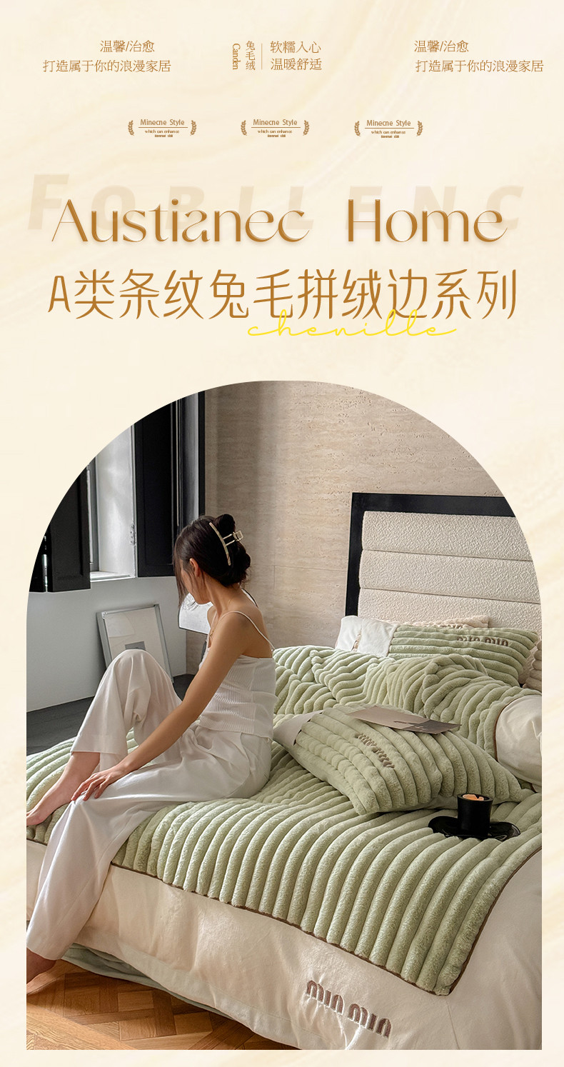 名品优仓 2024新款条纹兔绒拼绒边四件套-安露丝 安露丝-新芽绿