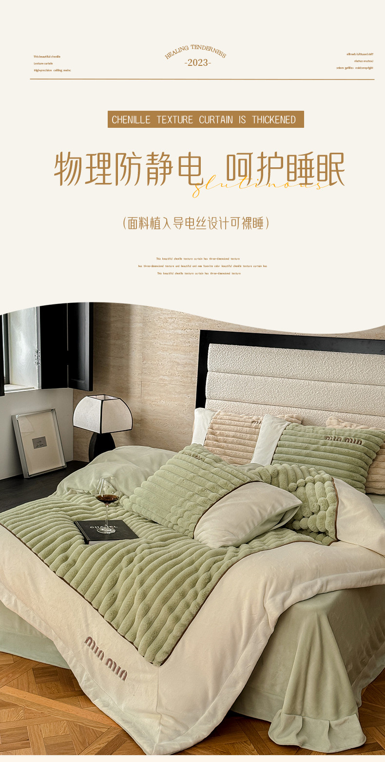 商品名称:名品优仓 2024新款条纹兔绒拼绒边四件套-安露丝 安露丝-新芽绿