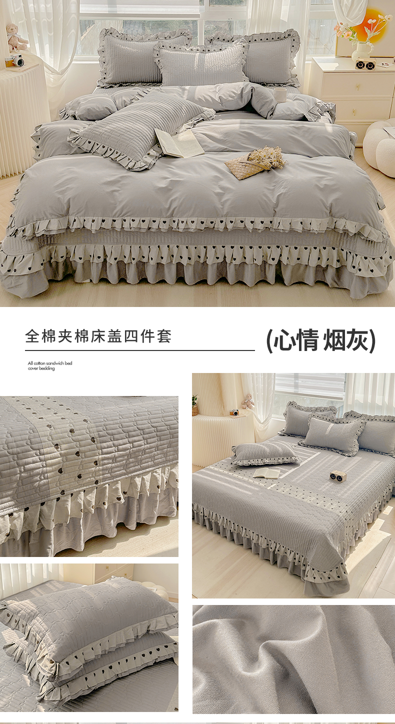 当前位置: 91家纺网 > 商品网购 > 床品套件 > 四件套 > 全棉普通四件套 > 宜凡家纺 2024新品全棉夹棉双层花边床盖四件套-心情 心情 烟灰