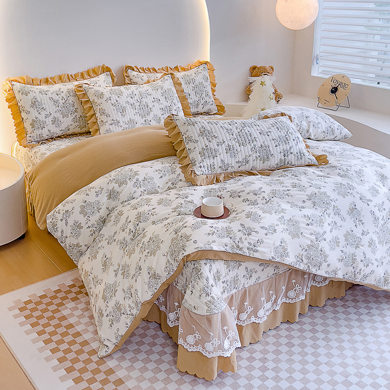 商品名称:2024直播爆款泡泡棉床盖款四件套双层蕾丝花边夹棉床裙款三件套 赫本