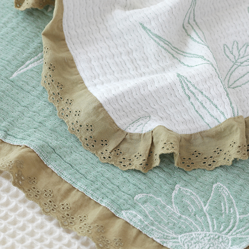 • 91家纺网 家纺一手货源 找家纺 朴尔毛巾被2024年新款韩式花边四层纱枕巾纯棉竹纤维加大成人纱布巾 怒放-绿52*78cm