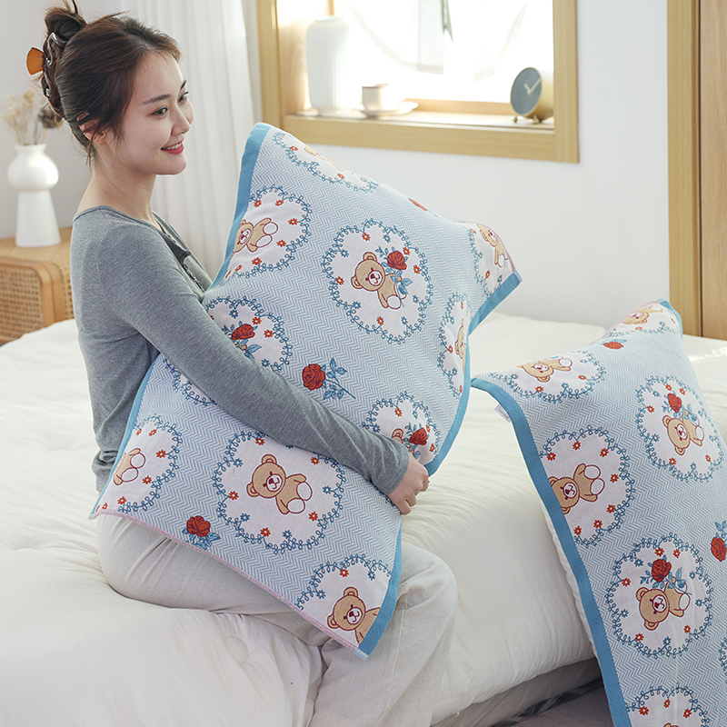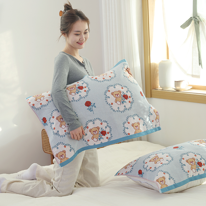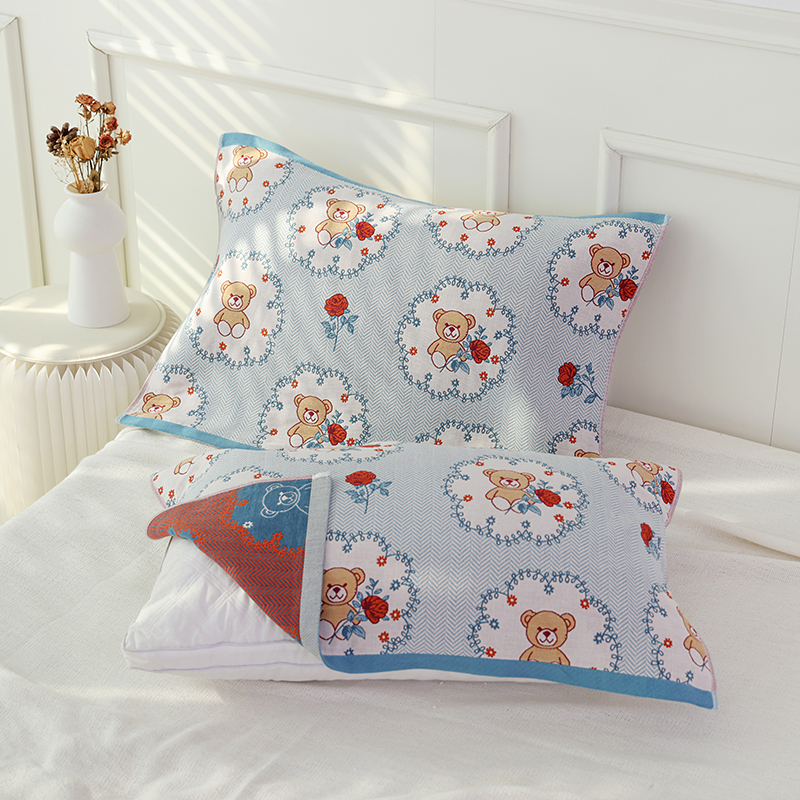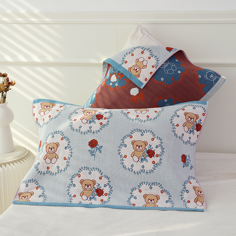 朴尔毛巾被2024年新品全棉细纱编织纹AB版透气枕巾 玫瑰熊熊52*78cm