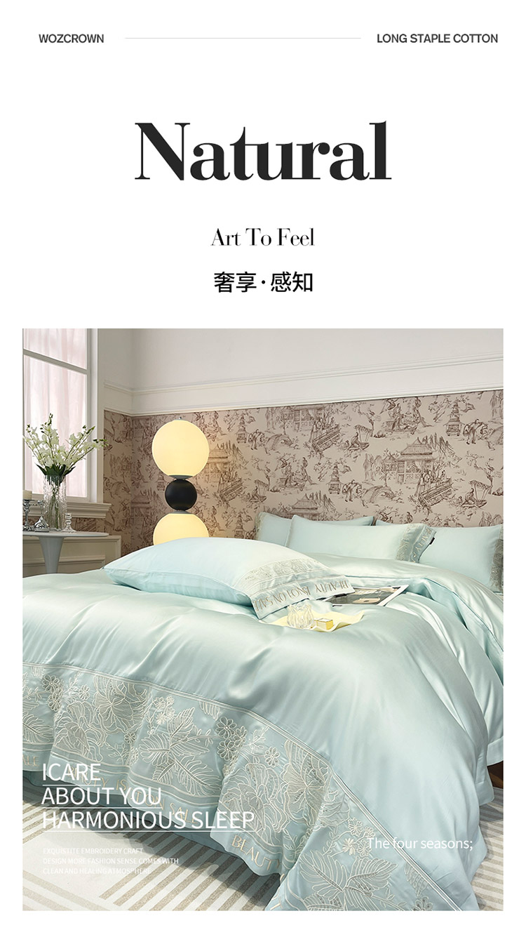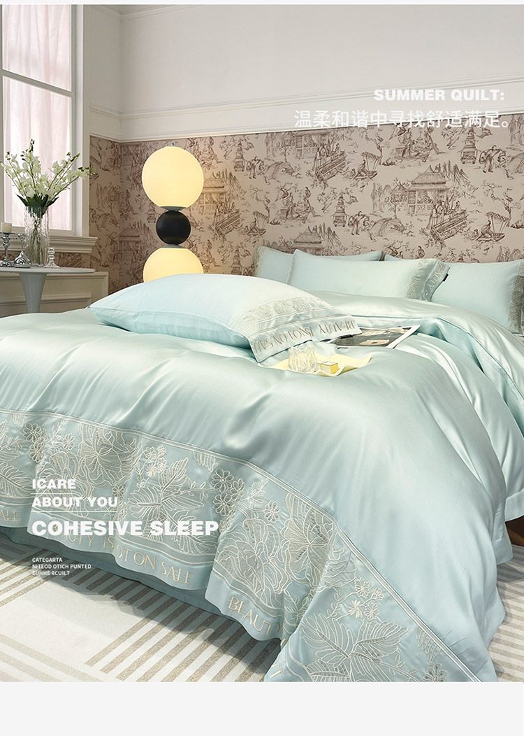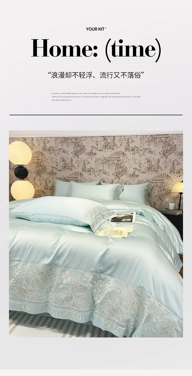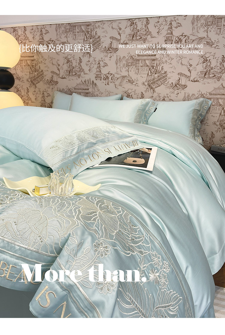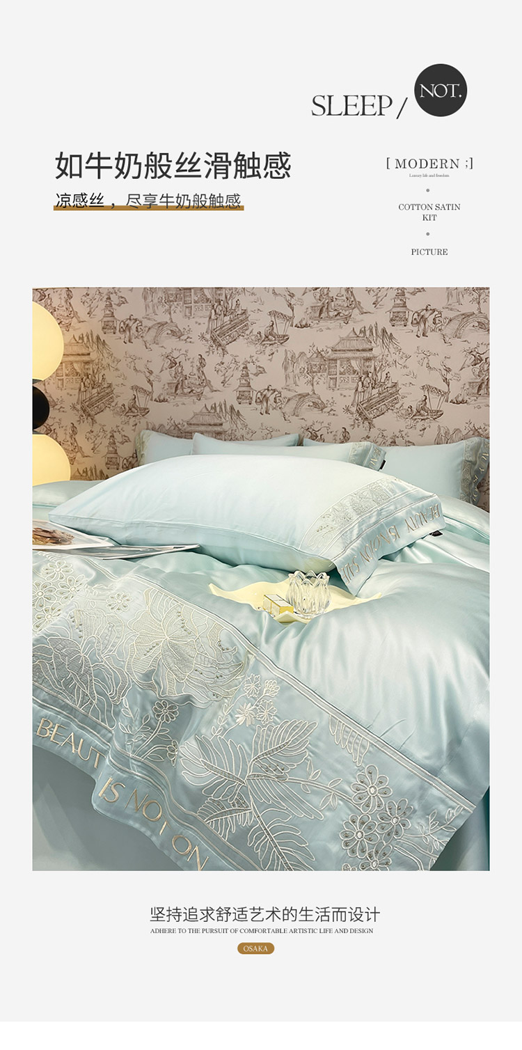 2024新款A类母婴级凉感真丝夏季裸睡丝滑床单床笠轻奢刺绣四件套 薄荷绿