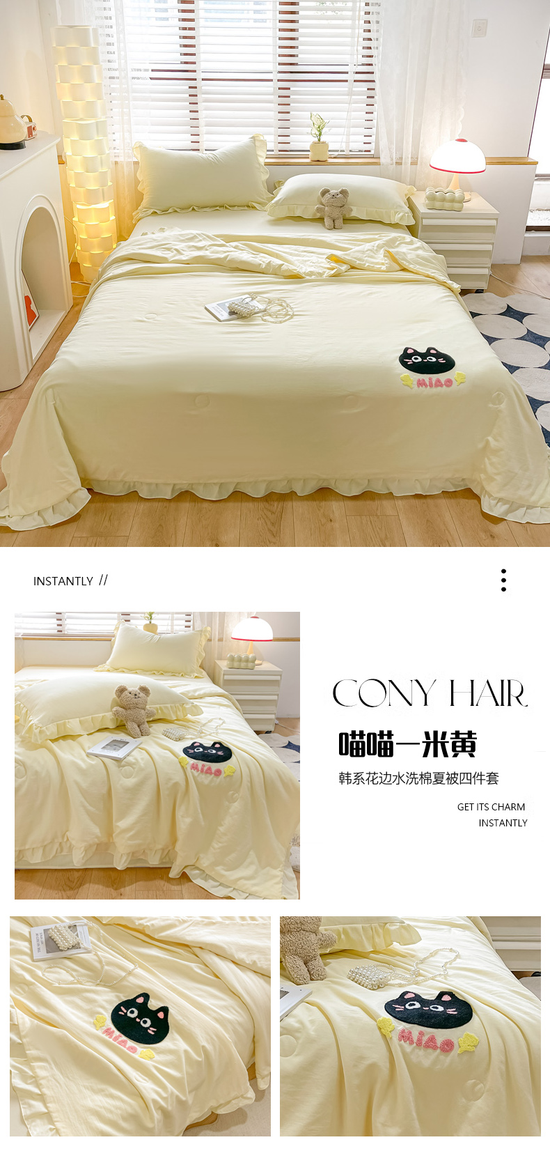 宜家坊2024新款韩系花边ins风水洗棉夏被四件套 喵喵-米黄