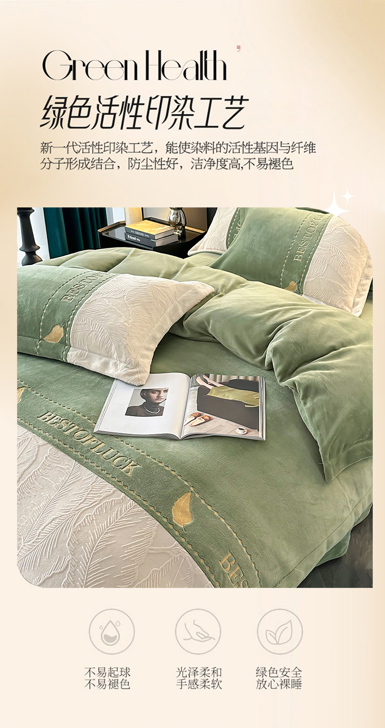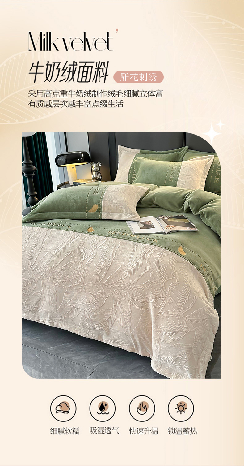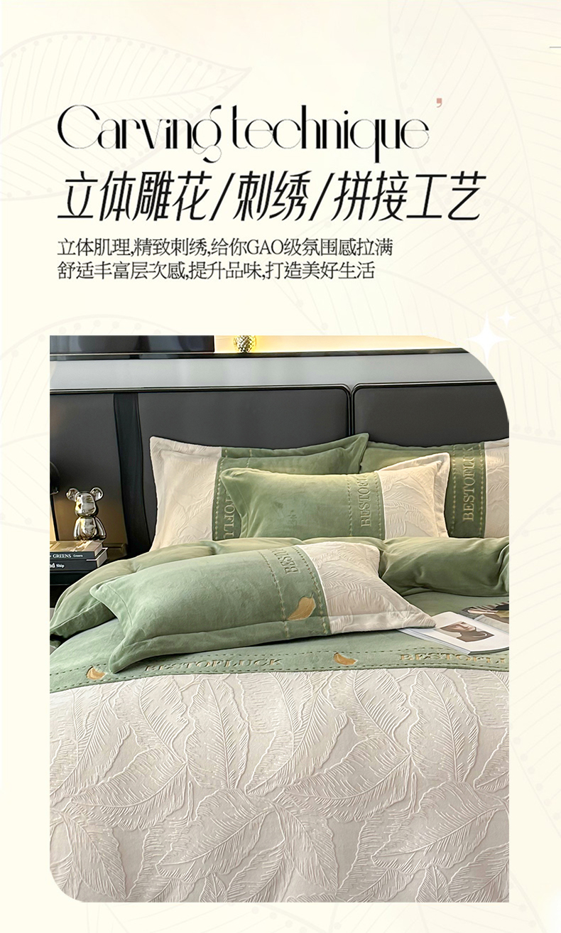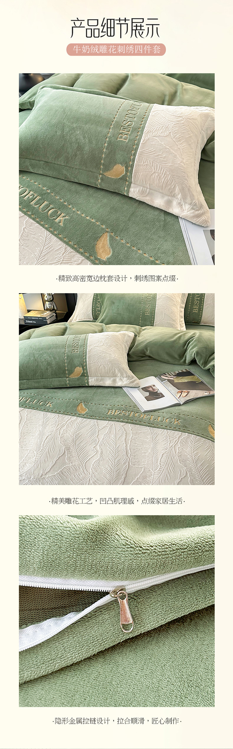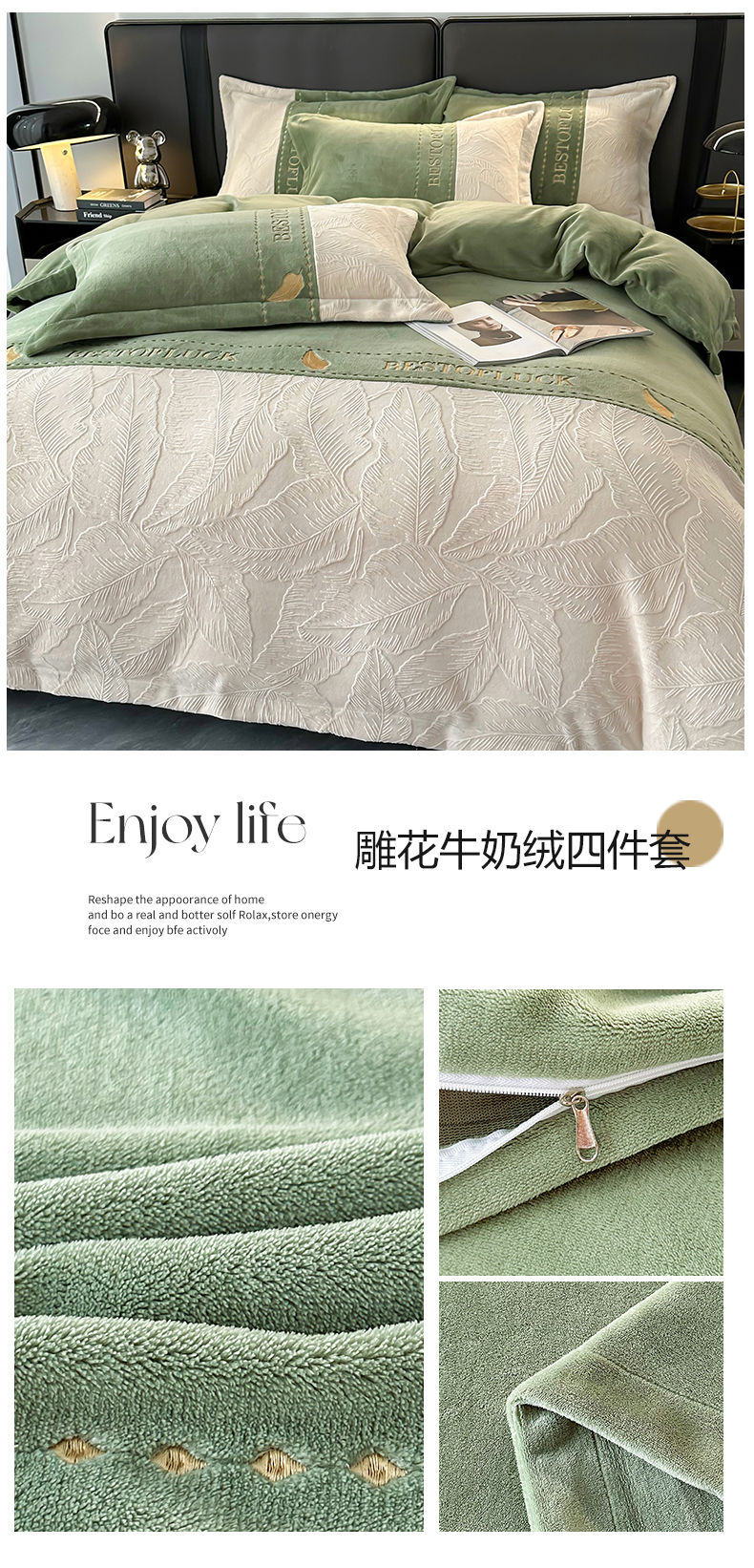 莱凯家纺 2025新款牛奶绒雕花刺绣四件套-叶屿 叶屿-绿
