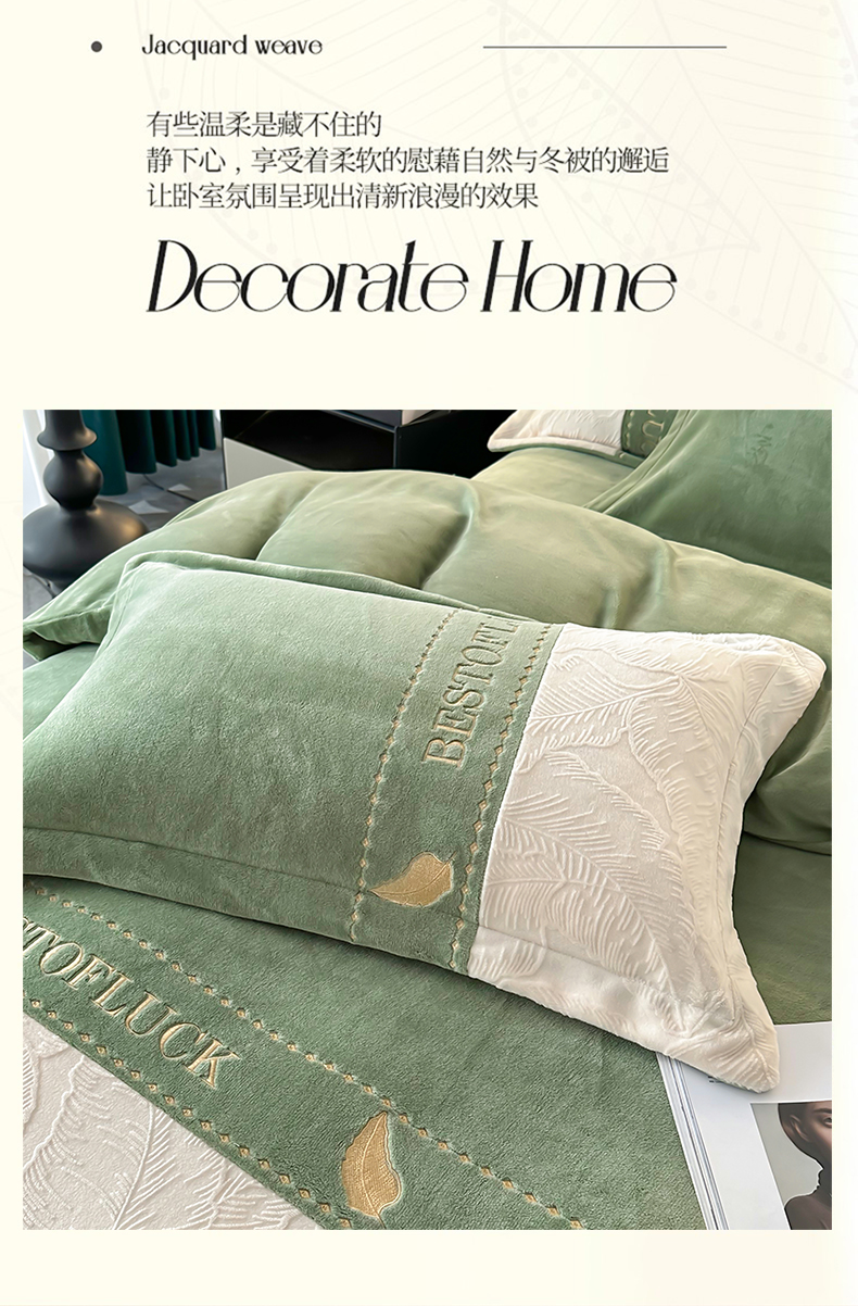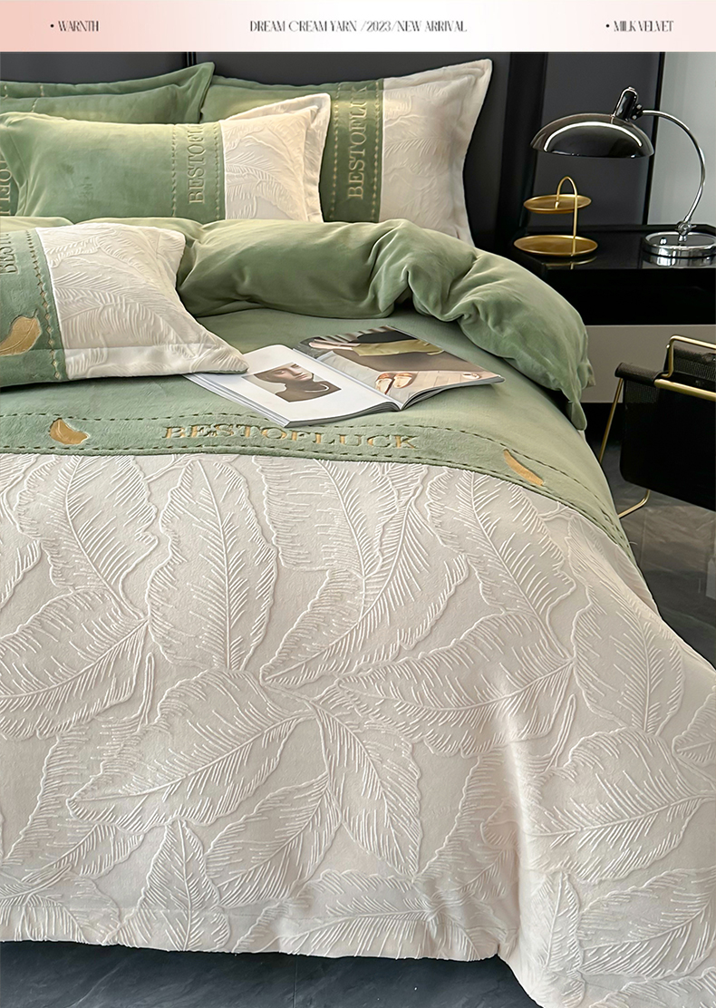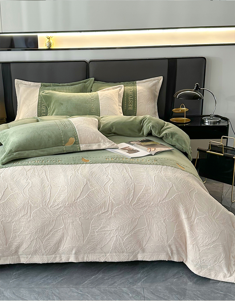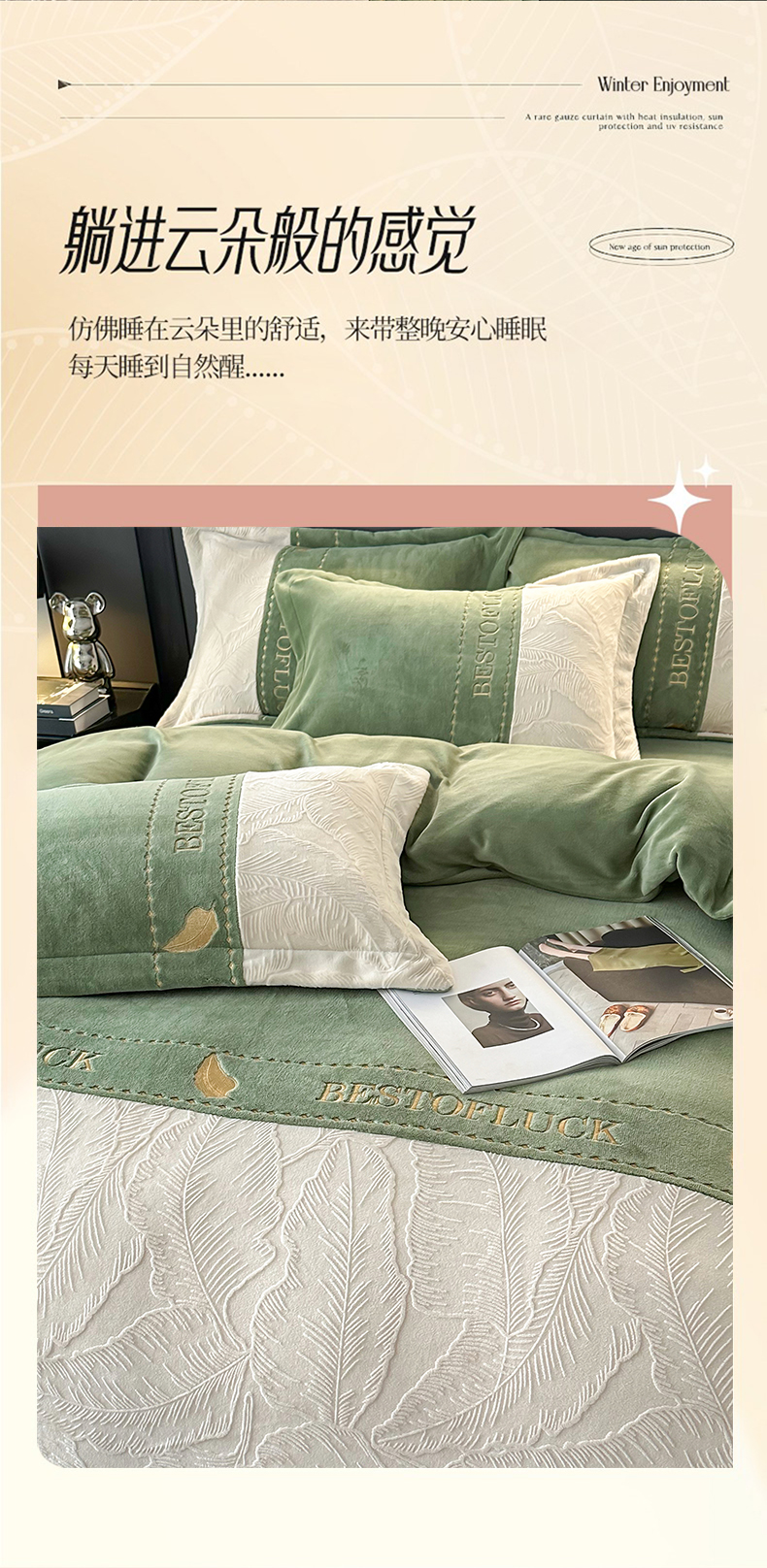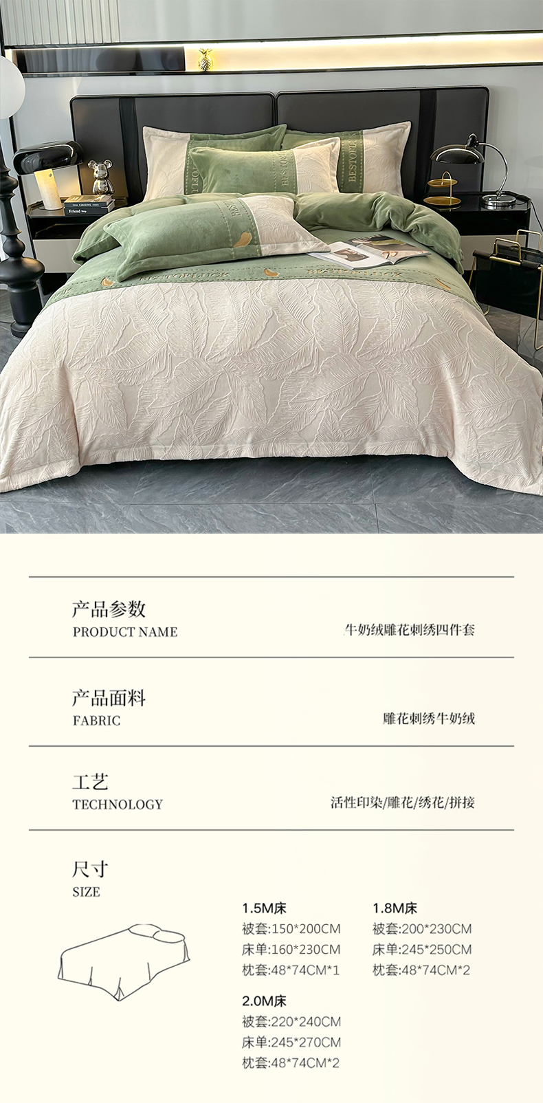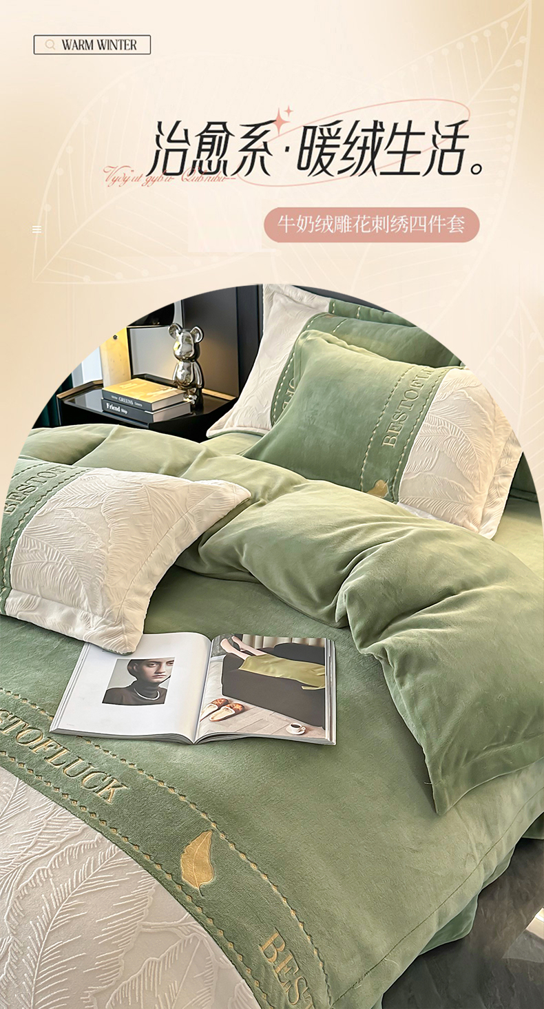 莱凯家纺 2025新款牛奶绒雕花刺绣四件套-叶屿 叶屿-绿