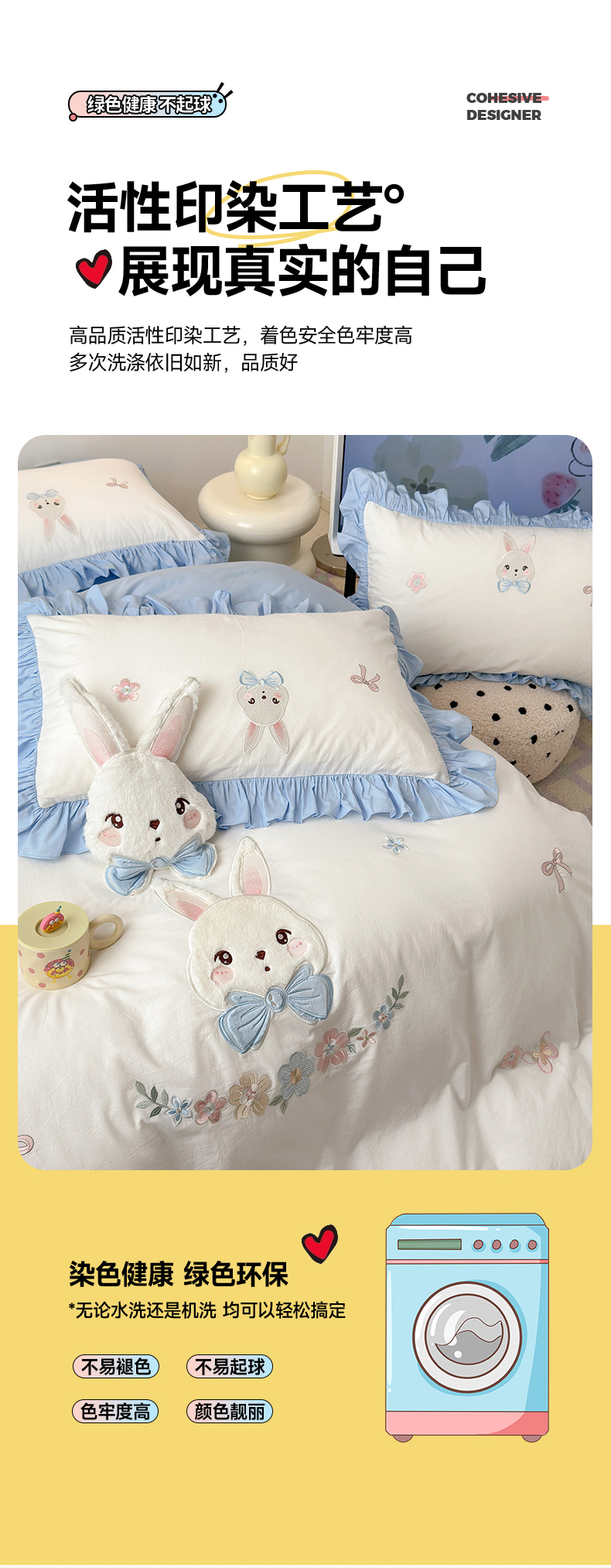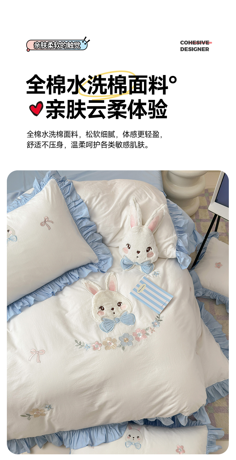 商品名称:蜜柚 2024新款全棉加厚水洗棉韩版小清新绣花工艺四件套-萌萌兔 萌萌兔白
